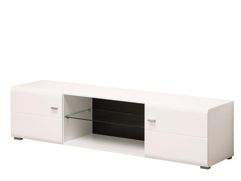 TV polica - u opak bijelom dezenu sa bijelom lak folijom, odraz je savremenog dizajna sa sofisticiranom notom koji će u potpunosti profilisati ambijent dnevne sobe. Posjeduje bočno smještene zatvorene dijelove i centralno pozicioniran otvoreni segment pogodan za audio-vizuelnu opremu.