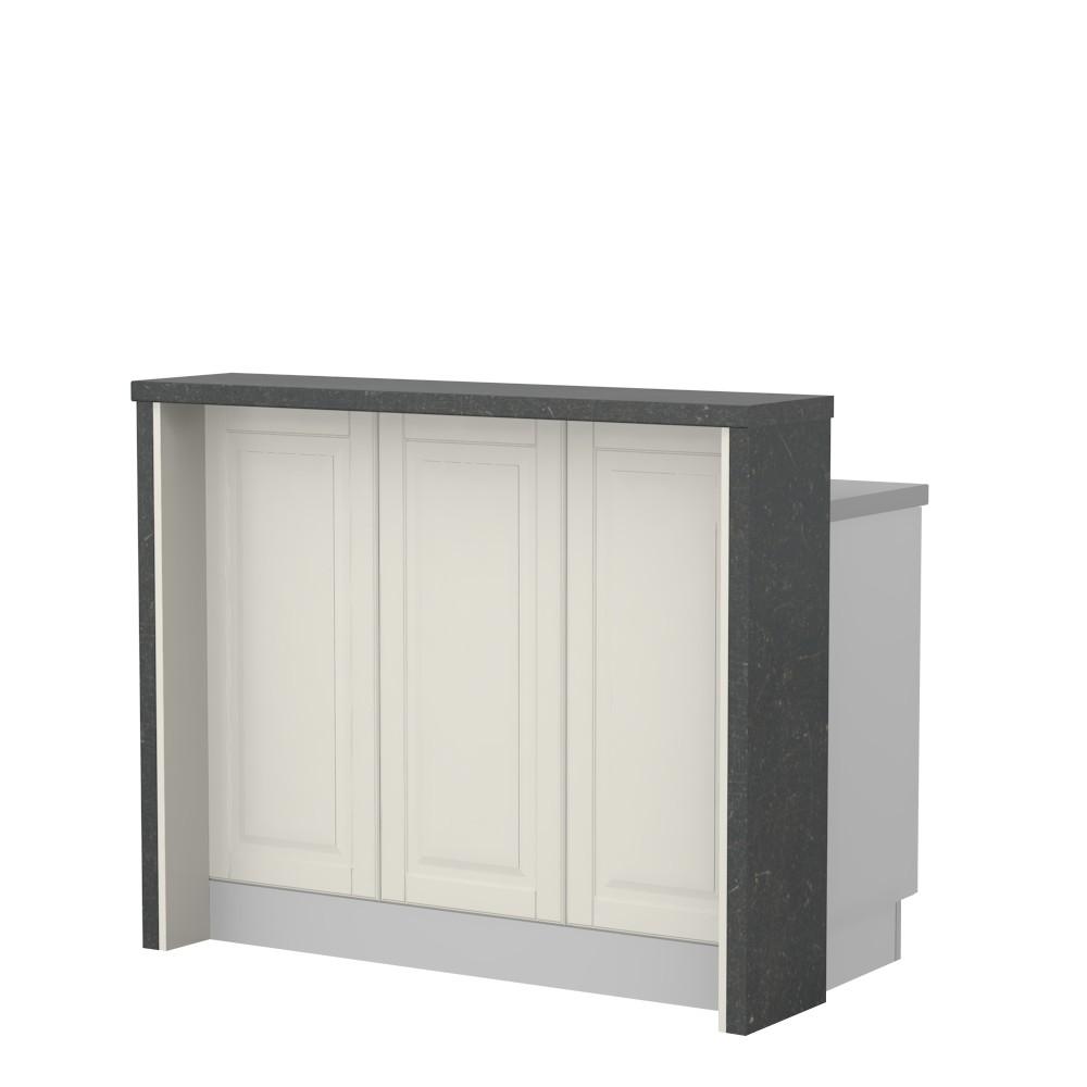 Kuhinjski pult prilagođen dužini radnih kuhinjskih elemenata od 120cm. U sastav pulta ulazi: radna ploča debljine 38mm u potrebnoj dužini, frontovi istog dizajna kao i izabran model kuhinje, bočne lajsne od medijapana u boji fronta i sokla sa dihtung gumom u potrebnoj dužini. Unutrašnje bočne aplikacije su u dekoru radne ploče.