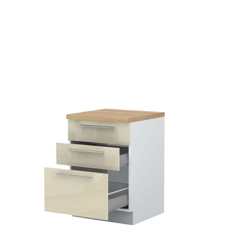 Radni kuhinjski element, širine 60cm, sa tri fioke. Metal-box fioka, nosivosti do 30kg, ima potpuno izvlačenje. Korpus fioke izrađen je u kombinaciji metala i univera debljine 16mm. Korpus elementa izrađen je od univera, debljine 18mm, u belom drvo dekoru. Front je lakiran UV lakom u visokom sjaju u boji prema Vašem izboru iz ponuđene palete boja ovog modela. Ova napredna tehnologija lakiranja omogućuje četiri puta otporniju površinu fronta na fizička oštećenja i habanje u odnosu na standardno lakiranje. Korpus elementa je kantovan sa zadnje strane. Ima podesive nožice za nivelisanje na svim površinama. Radna ploča debljine 38mm, skriveni klizači sa usporivačima i sokla sa dihtung gumom uračunati su u cenu proizvoda. U ponudi je sedam dekora radnih ploča i šest dekora sokle. Mogućnost odabira više modela ručica u različitim dimenzijama, koje nisu uračunate u cenu elementa. Obezbedite dugotrajnost radne ploče ugradnjom dihtung lajsne. Dihtung lajsna, dužine 4m, dostupna je u dekoru radne ploče. Ukoliko želite, uz izbor dodatne opreme, bele bočne stranice možete zameniti bočnim panelima lakiranim UV lakom u boji prema Vašem izboru iz ponuđene palete boja ovog modela ili od univera u drvo dekoru Nebraska hrast. Istaknite završne bočne strane kuhinje ugradnjom dodatnih panela, debljine 16mm, lakiranih UV lakom u visokom sjaju u boji prema Vašem izboru iz ponuđene palete boja ovog modela ili ugradnjom dodatnih panela od univera debljine 25mm, dostupnim u drvo dekorima bele boje i Nebraska hrast.