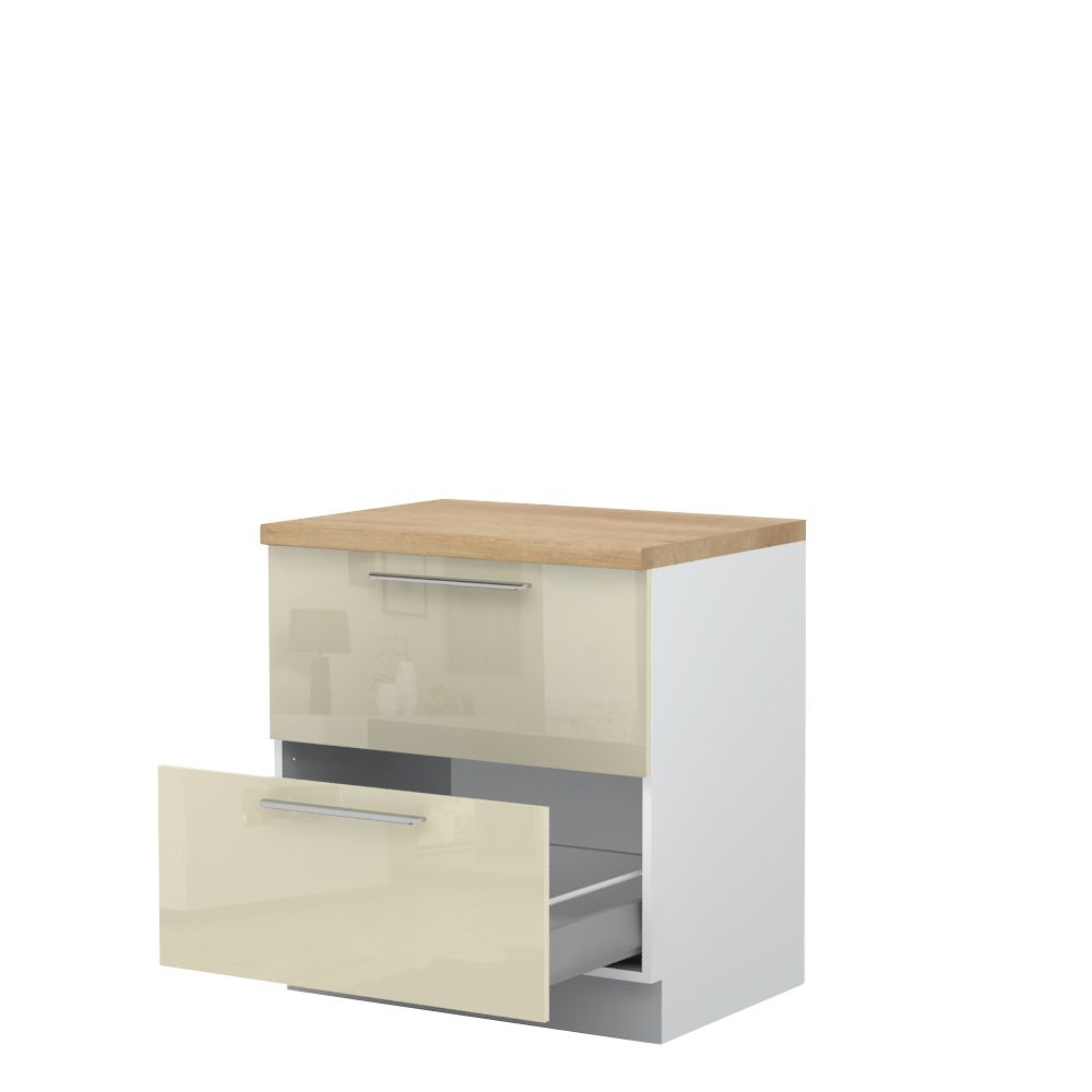 Radni kuhinjski element, širine 80cm, sa dve metal-box fioke. Metal-box fioka, nosivosti do 30kg, ima potpuno izvlačenje. Korpus fioke izrađen je u kombinaciji metala i univera debljine 16mm. Korpus elementa izrađen je od univera, debljine 18mm, u belom drvo dekoru. Front je lakiran UV lakom u visokom sjaju u boji prema Vašem izboru iz ponuđene palete boja ovog modela. Ova napredna tehnologija lakiranja omogućuje četiri puta otporniju površinu fronta na fizička oštećenja i habanje u odnosu na standardno lakiranje. Korpus elementa je kantovan sa zadnje strane. Ima podesive nožice za nivelisanje na svim površinama. Radna ploča debljine 38mm, skriveni klizači sa usporivačima i sokla sa dihtung gumom uračunati su u cenu proizvoda. U ponudi je sedam dekora radnih ploča i šest dekora sokle. Mogućnost odabira više modela ručica u različitim dimenzijama, koje nisu uračunate u cenu elementa. Obezbedite dugotrajnost radne ploče ugradnjom dihtung lajsne. Dihtung lajsna, dužine 4m, dostupna je u dekoru radne ploče. Ukoliko želite, uz izbor dodatne opreme, bele bočne stranice možete zameniti bočnim panelima lakiranim UV lakom u boji prema Vašem izboru iz ponuđene palete boja ovog modela ili od univera u drvo dekoru Nebraska hrast. Istaknite završne bočne strane kuhinje ugradnjom dodatnih panela, debljine 16mm, lakiranih UV lakom u visokom sjaju u boji prema Vašem izboru iz ponuđene palete boja ovog modela ili ugradnjom dodatnih panela od univera debljine 25mm, dostupnim u drvo dekorima bele boje i Nebraska hrast.