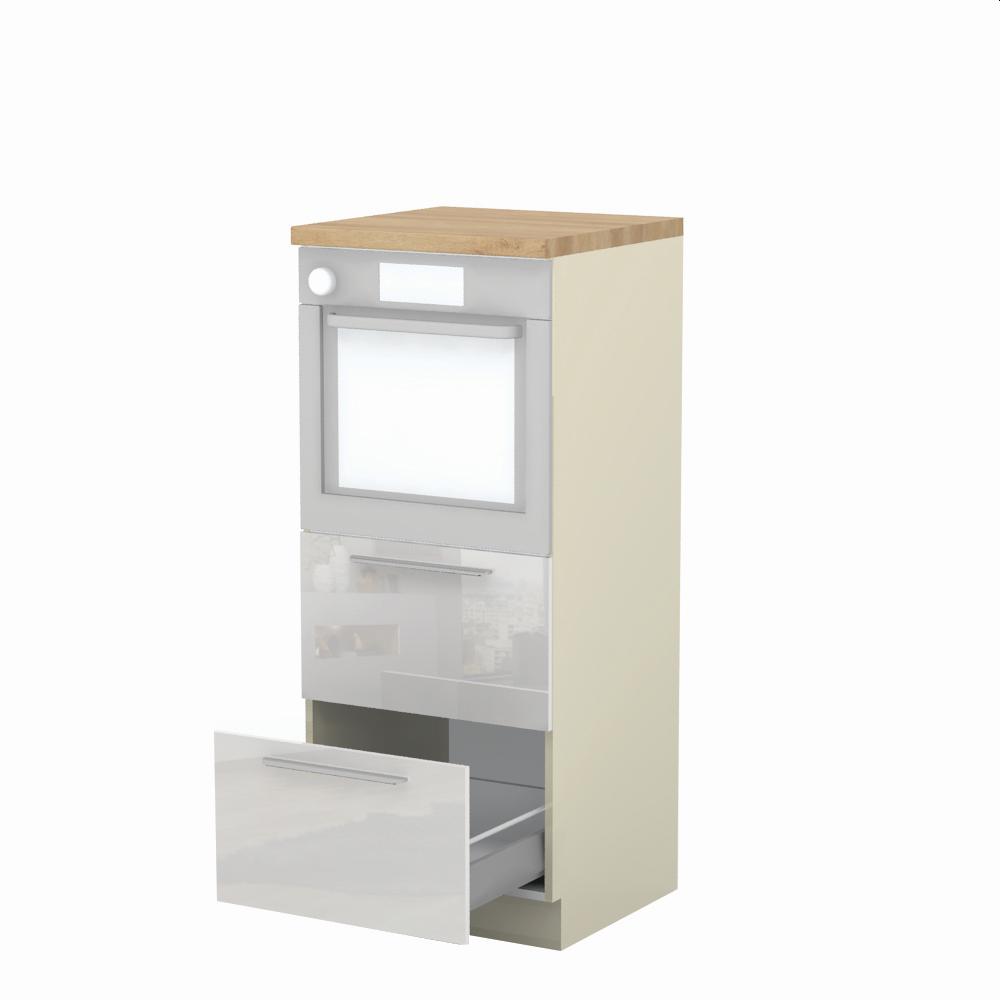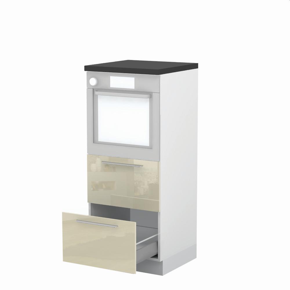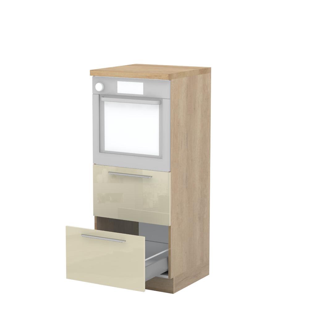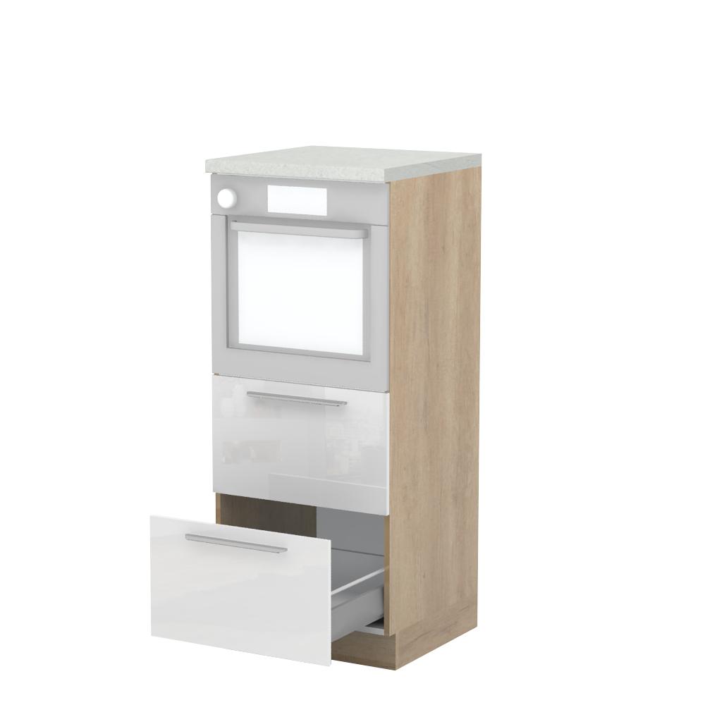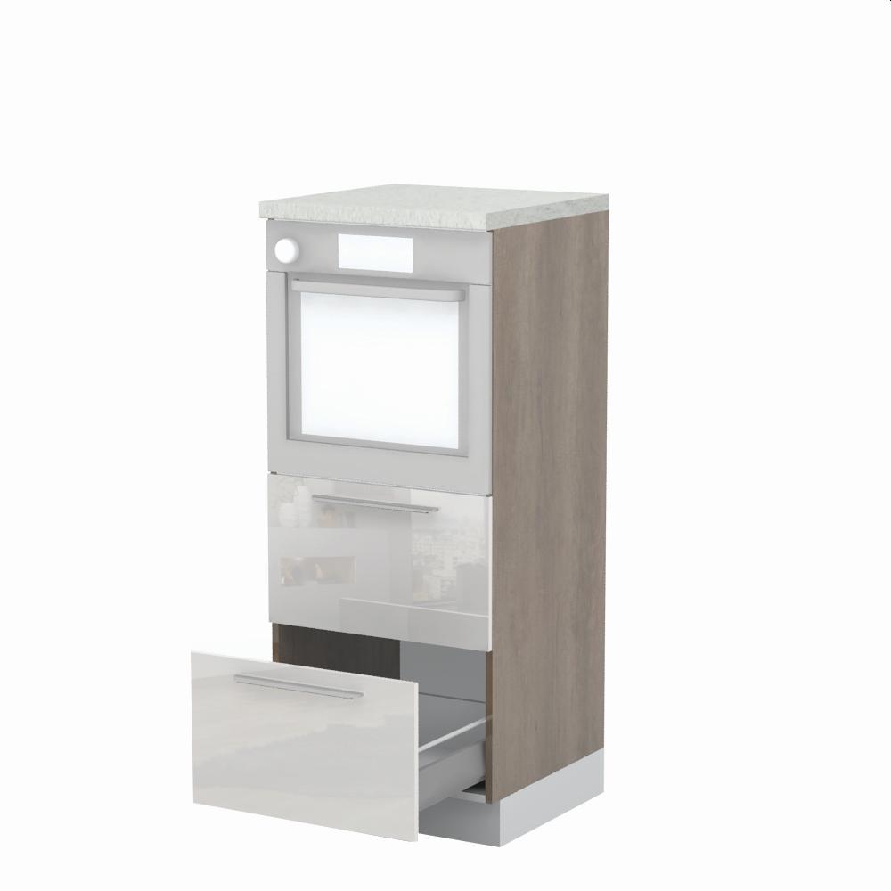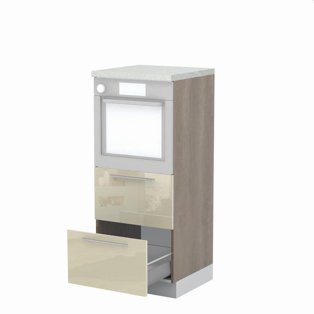 Kombinovani kuhinjski element, visine 148cm sa dve metal-box fioke, predviđen za ugradnju rerne. Metal-box fioka, nosivosti do 30kg, ima potpuno izvlačenje. Korpus fioke izrađen je u kombinaciji metala i univera debljine 16mm. Korpus elementa je od univera debljine 18mm, dok su bočne strane lakirane UV lakom u Kristaloj beloj, Bež boji u visokom sjaju ili drvo dekorima Nebraska i Tamna Nebraska u sjaju. Front je lakiran UV lakom u visokom sjaju u boji prema Vašem izboru iz ponuđene palete boja ovog modela. Ova napredna tehnologija lakiranja omogućuje četiri puta otporniju površinu fronta na fizička oštećenja i habanje u odnosu na standardno lakiranje. Plafon elementa je radna ploča u jednom od sedam različitih dekora iz ponude. Korpus elementa je kantovan sa zadnje strane. Element ima podesive nožice za nivelisanje na svim površinama. Soft-close šarke i sokla sa dihtung gumom uračunati su u cenu proizvoda. U ponudi su šest dekora sokle. Mogućnost odabira više modela ručica u različitim dimenzijama, koje nisu uračunate u cenu elementa. Istaknite završne bočne strane kuhinje ugradnjom dodatnih panela, debljine 16mm, lakiranih UV lakom u visokom sjaju u boji prema Vašem izboru iz ponuđene palete boja ovog modela ili ugradnjom dodatnih panela od univera debljine 25mm, dostupnim u drvo dekorima bele boje i Nebraska hrast.Radni vek ugradne tehnike može se produžiti boljom cirkulacijom vazduha unutar elementa, uz pomoć aluminijumske rešetke, koja se ugrađuje u soklu.