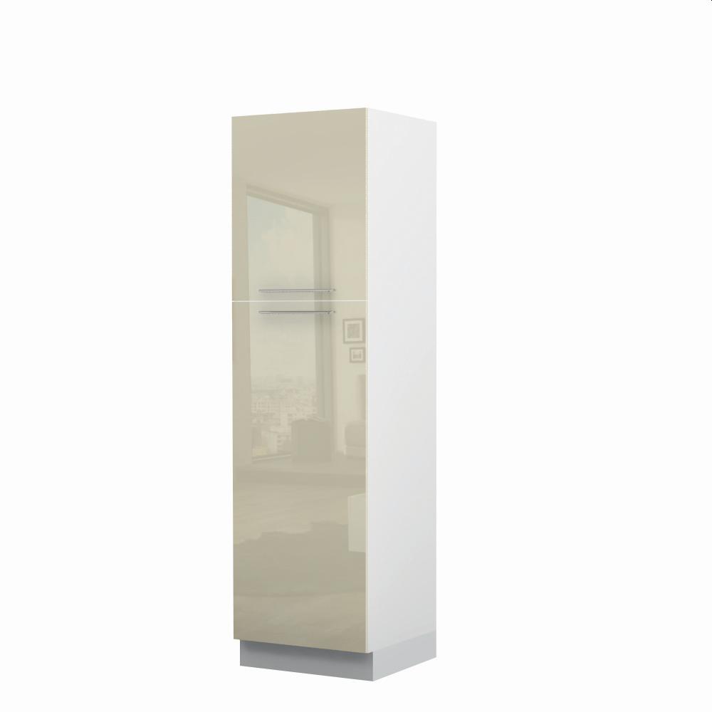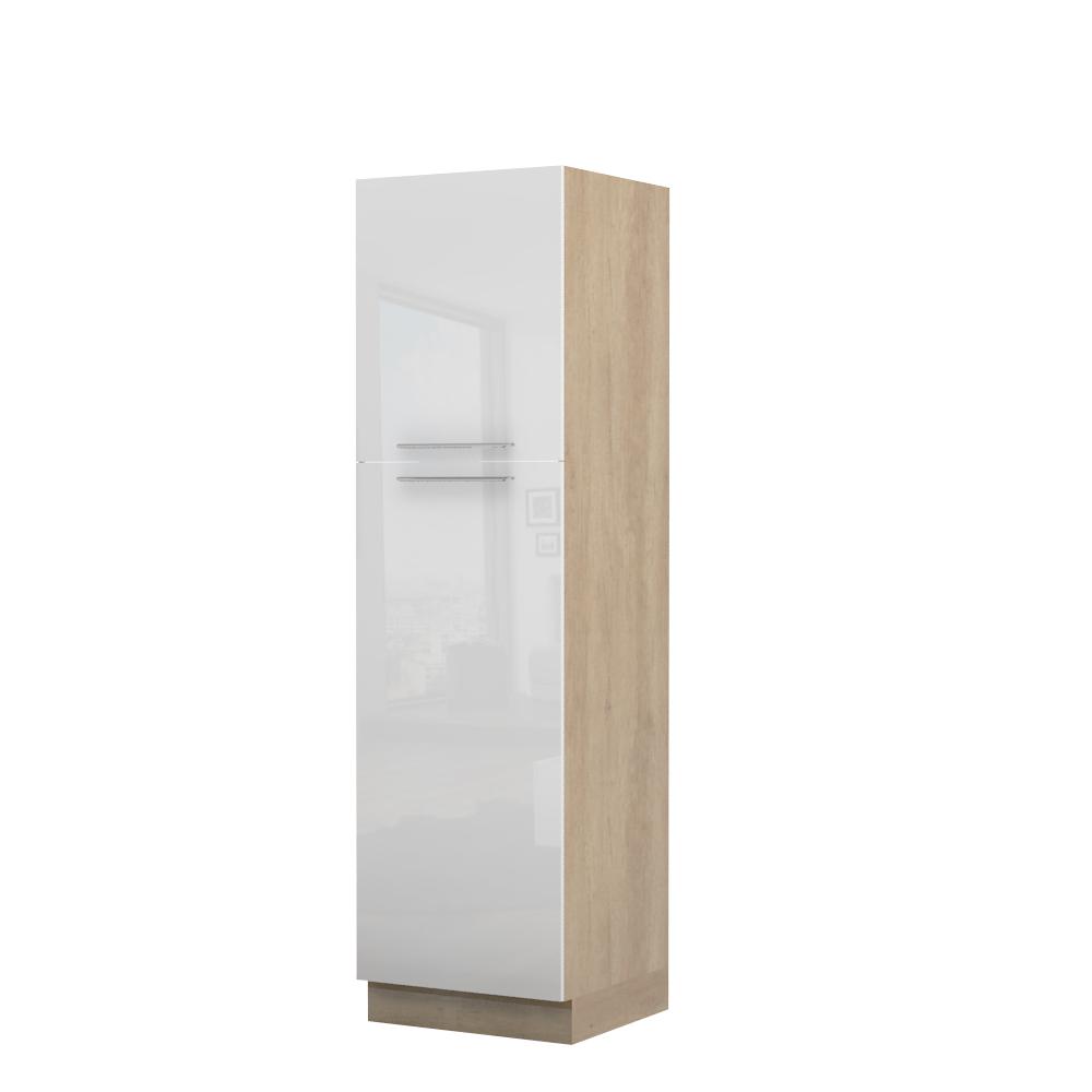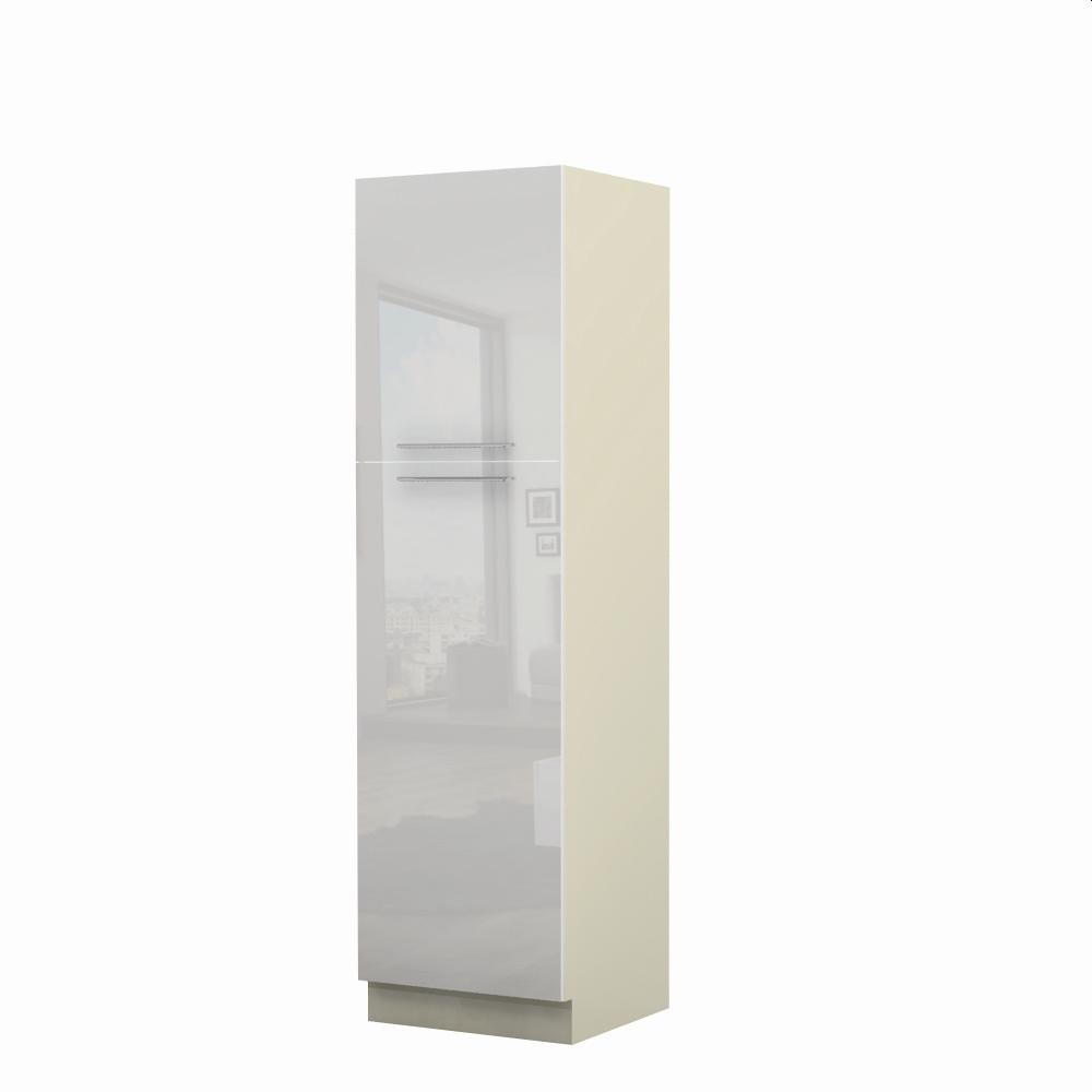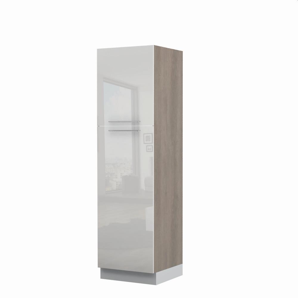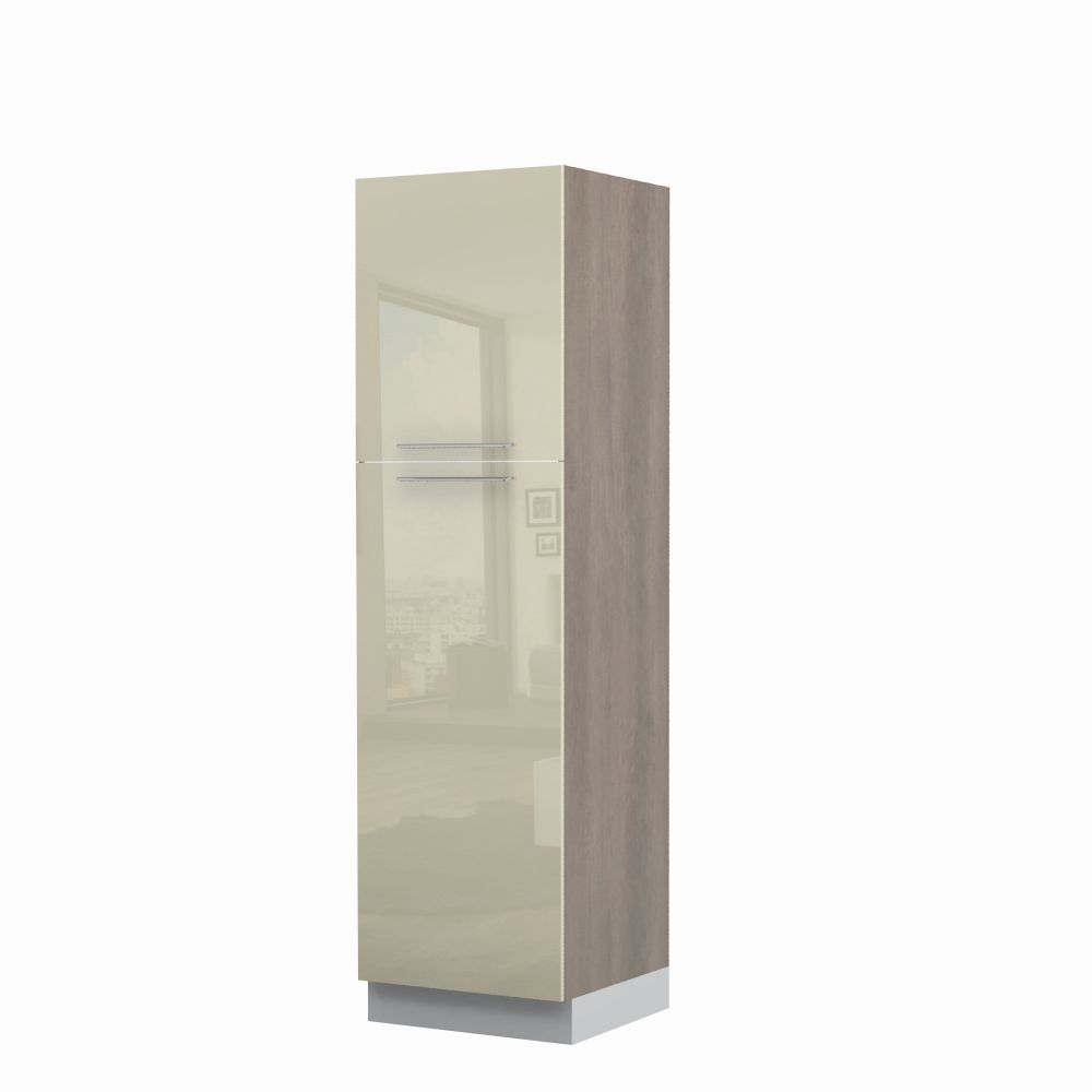 Kombinovani kuhinjski element, visine 216cm, predviđen za ugradnju frižidera. Kompatibilan je sa kuhinjama sa visećim elementima visine 72cm (V7). Korpus elementa je od univera debljine 18mm u belom drvo dekoru, dok su bočne strane lakirane UV lakom u Kristaloj beloj, Bež boji u visokom sjaju ili drvo dekorima Nebraska i Tamna nebraska u sjaju. Front je lakiran UV lakom u visokom sjaju u boji prema Vašem izboru iz ponuđene palete boja ovog modela. Ova napredna tehnologija lakiranja omogućuje četiri puta otporniju površinu fronta na fizička oštećenja i habanje u odnosu na standardno lakiranje. Ima jednu policu i jedan štelujući panel sa metalnim “L†nosačima, za pozicioniranje ugradnog frižidera. Korpus elementa je kantovan sa zadnje strane. Ima podesive nožice za nivelisanje na svim površinama. Soft-close šarke i sokla sa dihtung gumom uračunati su u cenu proizvoda. U ponudi su šest dekora sokle. Mogućnost odabira više modela ručica u različitim dimenzijama, koje nisu uračunate u cenu elementa. Istaknite završne bočne strane kuhinje ugradnjom dodatnih panela, debljine 16mm, lakiranih UV lakom u visokom sjaju u boji prema Vašem izboru iz ponuđene palete boja ovog modela ili ugradnjom dodatnih panela od univera debljine 25mm, dostupnim u drvo dekorima bele boje i Nebraska Hrast. Štelujući panel, kao dodatna oprema, može imati funkciju dodatne police. Radni vek frižidera može se produžiti boljom cirkulacijom vazduha unutar elementa, uz pomoć aluminijumske rešetke, koja se ugrađuje u soklu.
