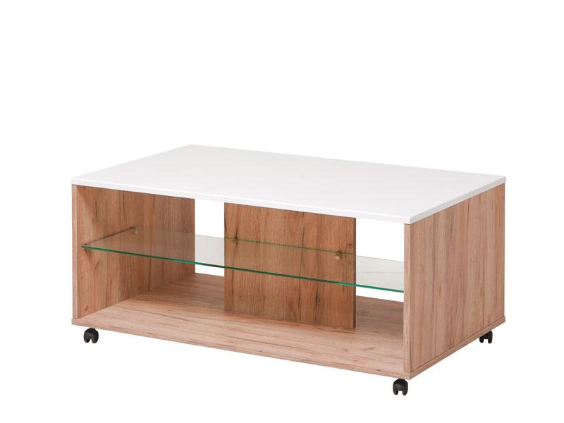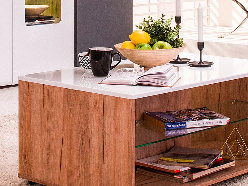 Klub stol BERT, u dekoru zlatnog hrasta sa bijelom lak folijom, posjeduje praktične i estetske efektne staklene police ispod radne površine pogodne za odlaganje omiljenih knjiga ili časopisa. Klub stol BERT doprinosi savremenom tematskom konceptu uređenja dnevnog boravka.