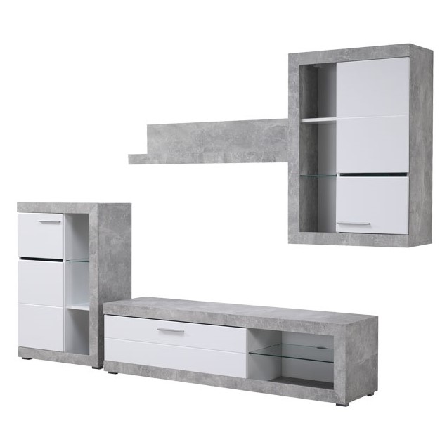 Regal - u kombinaciji beton dekora i opak bijele, sa frontovima presvučenim bijelom 3D MDF lak folijom, dizajniran je da zadovolji funkcionalne i estetske zahtjeve u uređenju svakog ambijenta. Regal omogućava kompletno opremanje dnevnog boravka, zahvaljujući izuzetno praktičnom rasporedu otvorenih i zatvorenih polica. Postoji mogućnost dodavanja LED rasvjete.