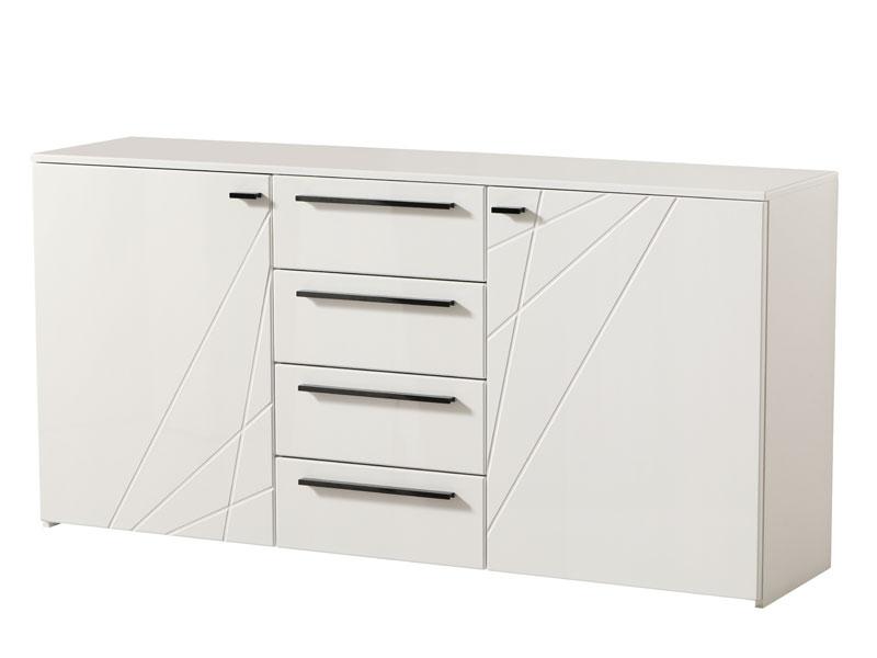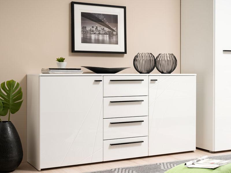 Komoda u opak bijelom dezenu sa frontovima presvučenim bijelom 3D MDF lak folijom, dio je kolekcije elemenata spavaće sobe. Komoda posjeduje bočne segmente sa pregradnom policom i četiri funkcionalne fioke, smještene u centralnom dijelu.