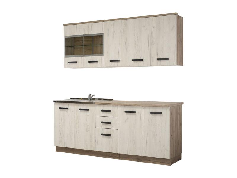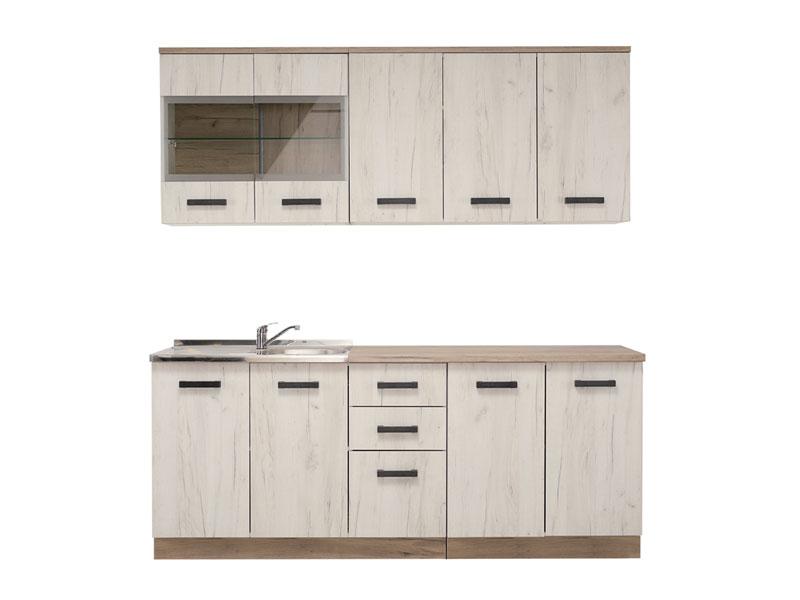 Kuhinja KENT 200, u sivom i bijelom hrast dezenu, dizajnirana je da zadovolji funkcionalne i estetske zahtjeve u opremanju ambijenta kuhinje. Uspješna upotrebna rješenja koja se sastoje od standardnih i poluzastakljenih dvokrilnih i jednokrilnih visećih elemenata, kao i donjih elementa, sa kombinacijom frontalnog dijela i praktičnih fioka, primjer su za sklad i dobru organizaciju. Kuhinja KENT 200 je dio istoimene kolekcije koja u vaš dom unosi dodir otmjene klasike i rafiniranog ukusa. Dubina gornjeg dijela je 28,2 cm, dubina donjeg dijela je 49,5 cm, dubina radne ploče je 60 cm.