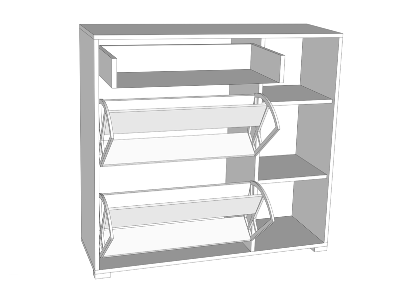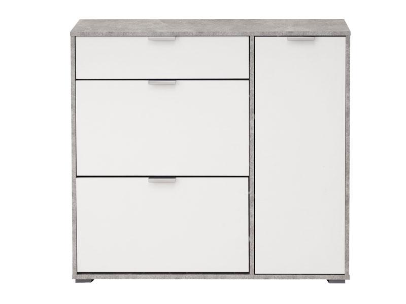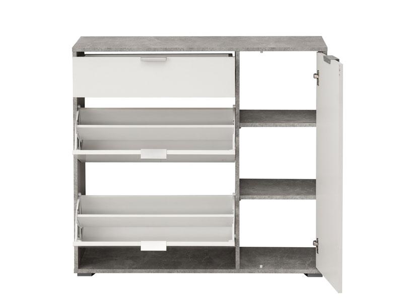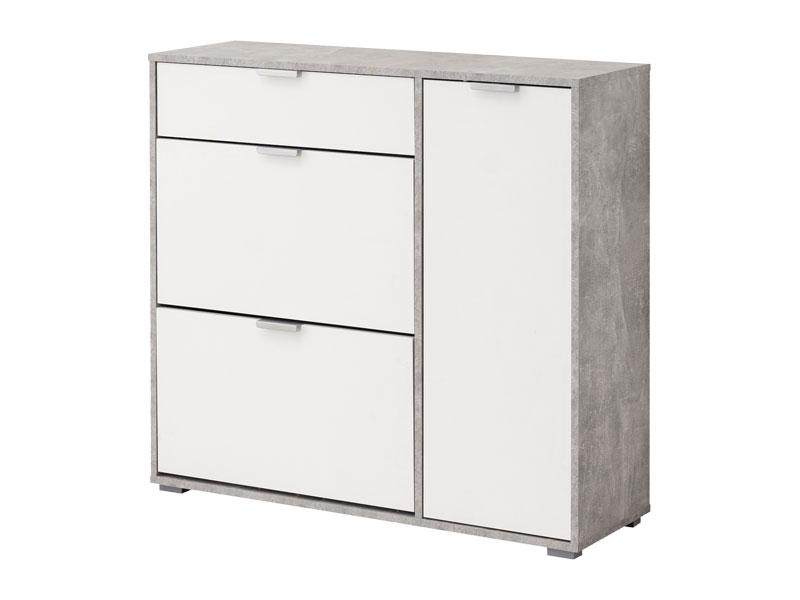 Cipelar u opak bijelom dezenu, idealno je rešenje za uklapanje u prostore različitih dimenzija. Ovaj model posjeduje dva segmenta za odlaganje obuće, praktičnu fioku i desno pozicioniran dio sa dvije police.