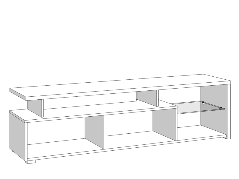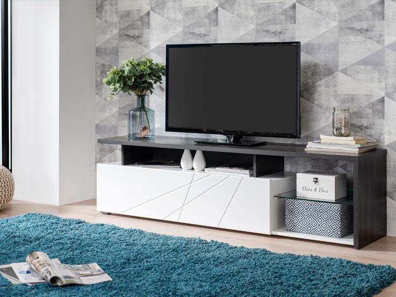 TV polica, u dekoru crnog drveta i bijeloj 3D MDF lak foliji sa aplikacijom na frontu, posjeduje kombinaciju otvorenog i zatvorenog segmenta. TV polica sa izdignutim dijelom prati interijerske inovacije, zahvaljujući čemu će se idealno integrirati u ambijent vašeg dnevnog boravka.