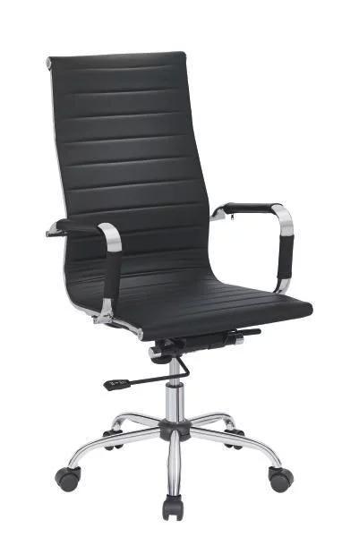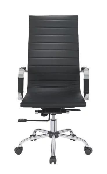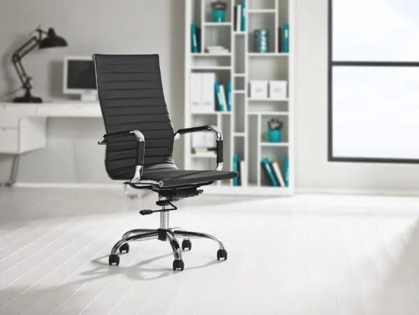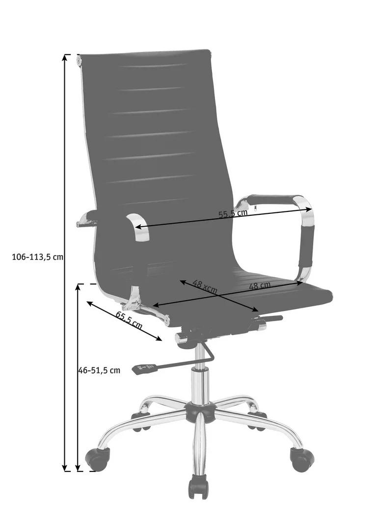 Atraktivna okretna stolica s lakoodrživom navlakom od umjetne kože crne boje i kromiranim metalnim postoljem. Visoki naslon za leđa i nasloni za ruke pružaju ugodan komfor sjedenja.