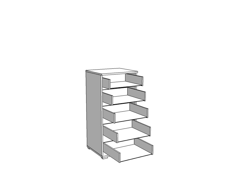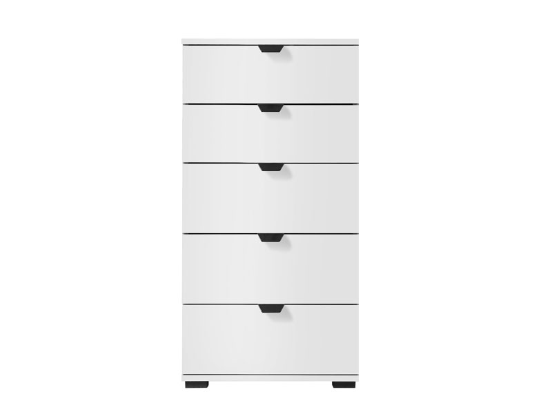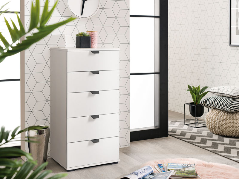 Komoda u kombinaciji opak bijelog dekora i bijele lak folije je dizajnirana tako da po svojim dimenzijama širine, od 45 cm, ne zauzima mnogo prostora, a zahvaljujući upotrebnom prostoru koji obezbjeđuje pet fioka, spada u elemente sa velikom upotrebnom vrijednošću. Komoda je pogodna za opremanje predsoblja, dnevne zone ili spavaće sobe.