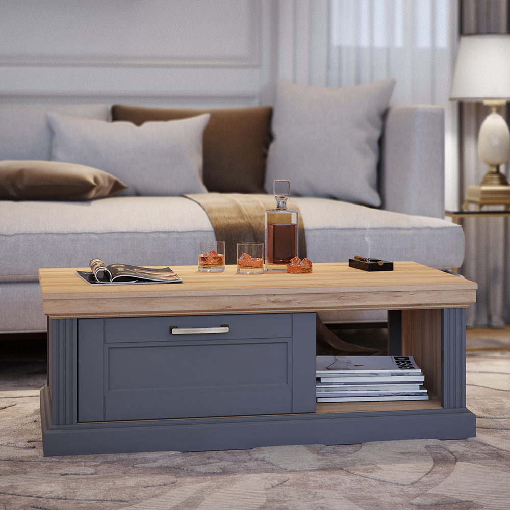 Klub stol za dnevni boravak iz kolekcije Tara sa jednom fiokom i otvorenom policom.