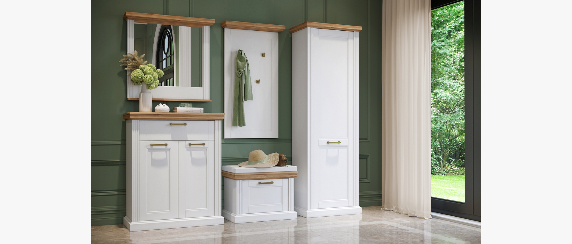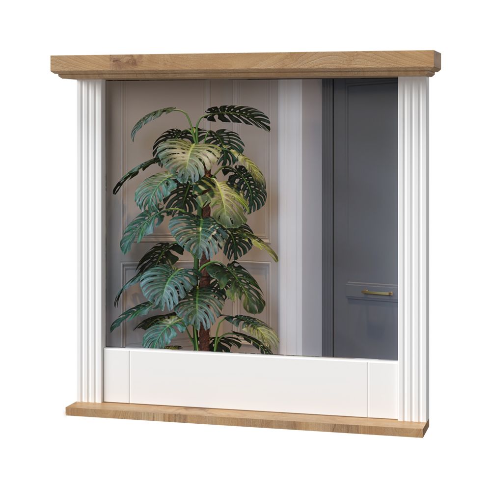 Ogledalo za predsoblje, iz kolekcije TARA, sa ramom od stilski profiliranih lajsni izrađenih od medijapana kompletno lakiranog UV lakom sa soft mat efektom u bijeloj boji i masivnom pokrivnom pločom u dekoru Pacifik orah .