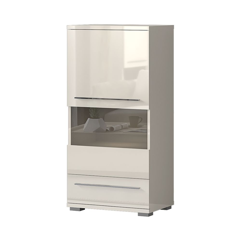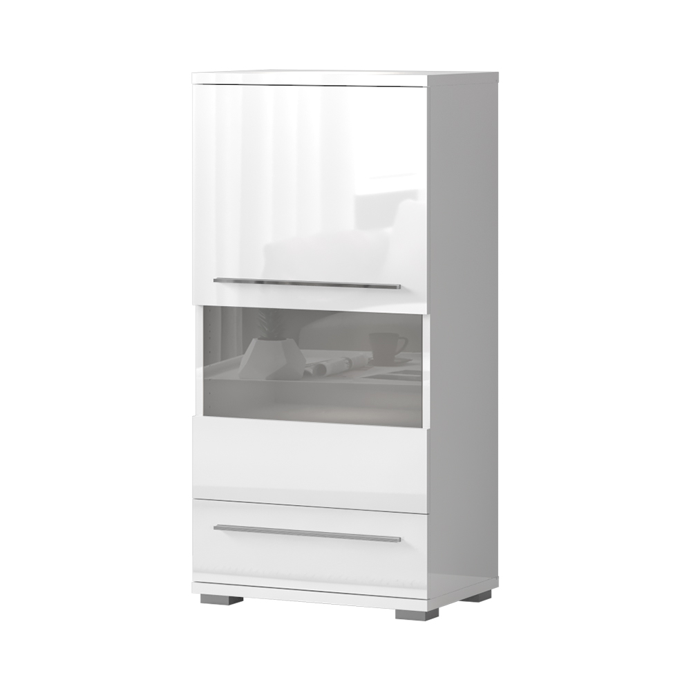 Funkcionalna vitrina iz kolekcije nameštaja PIANO sa jednim staklenim krilom I jednom fiokom, dizajnirane geometrijske forme.