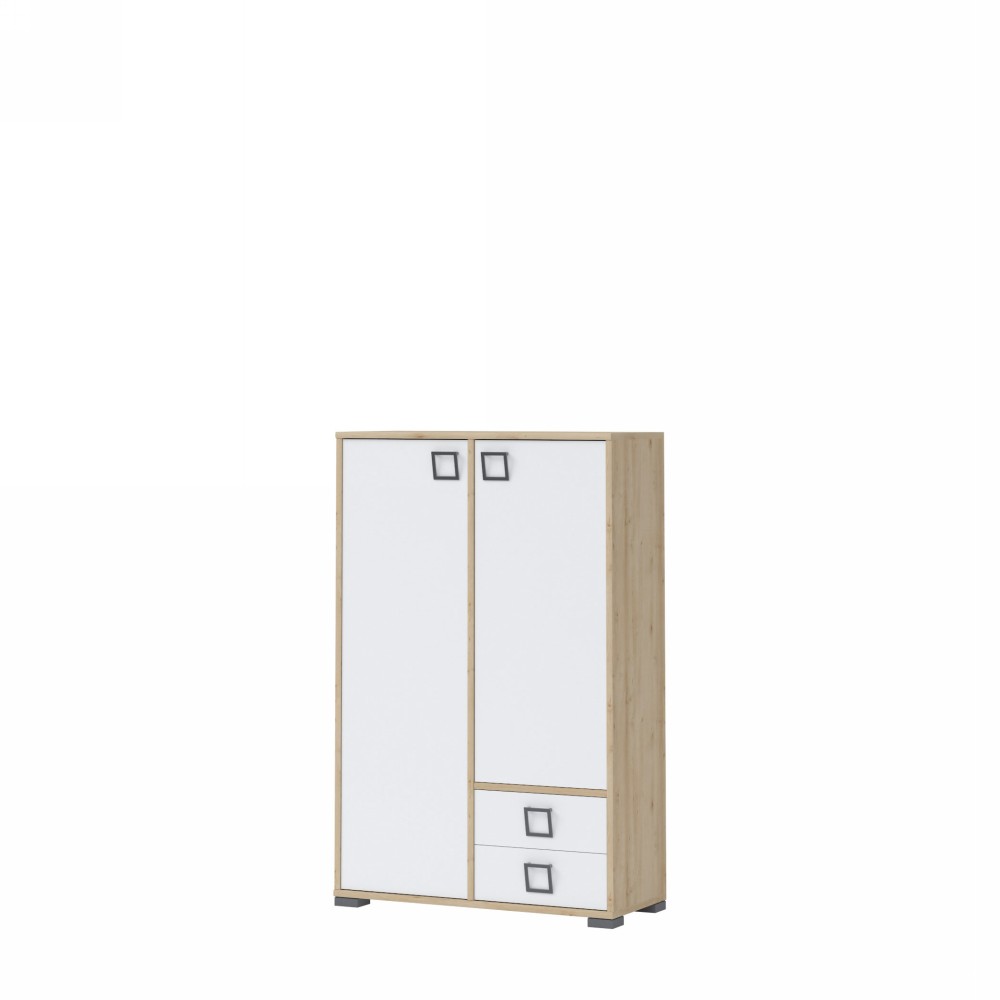 Komoda za dječiju sobu sa dva krila i dvije fioke. Raspored krila se može mijenjati, a zavisno od pozicije kraćeg krila, fioke se mogu montirati u uglovima pa ovaj element može imati četiri različita izgleda