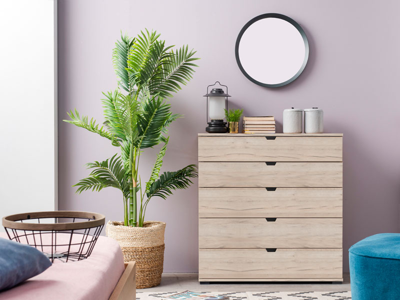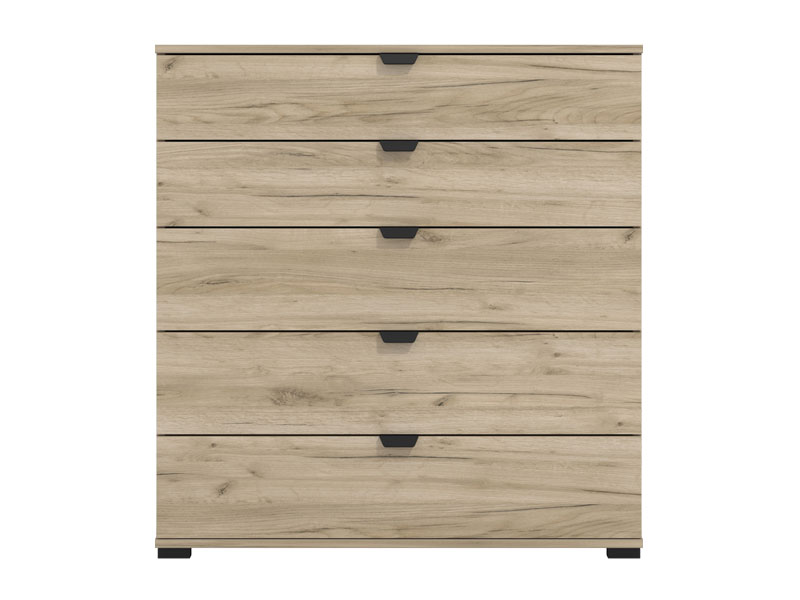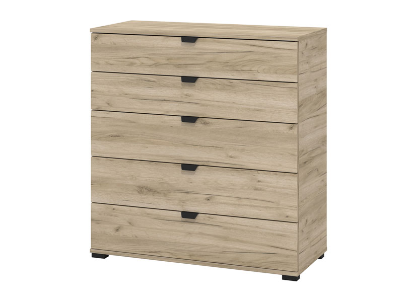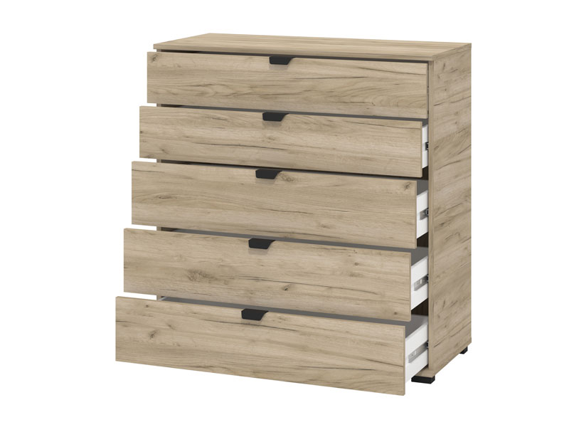 Komoda u dekoru sivog hrasta dizajnirana je tako da zahvaljujući upotrebnom prostoru koji obezbjeđuje pet prostranih fioka, spada u elemente sa velikom upotrebnom vrijednošću. Komoda je pogodna za opremanje predsoblja, dnevne zone ili spavaće sobe.