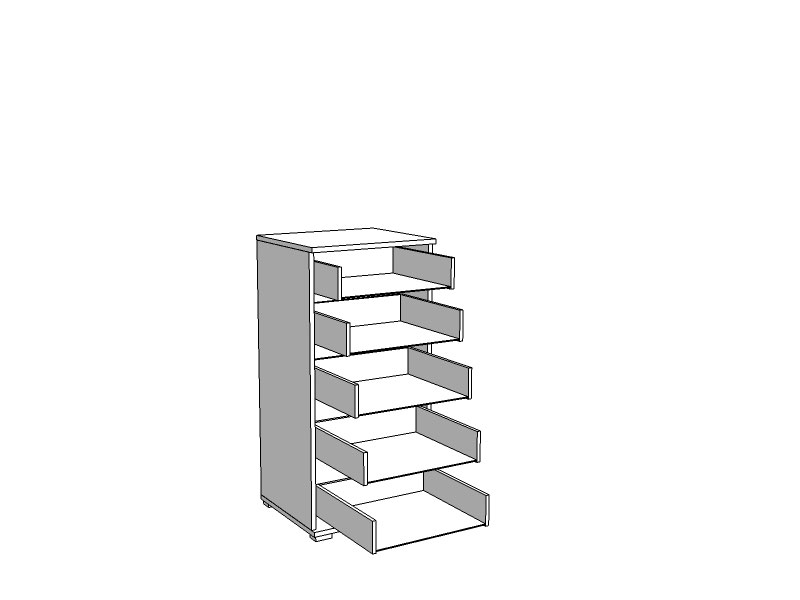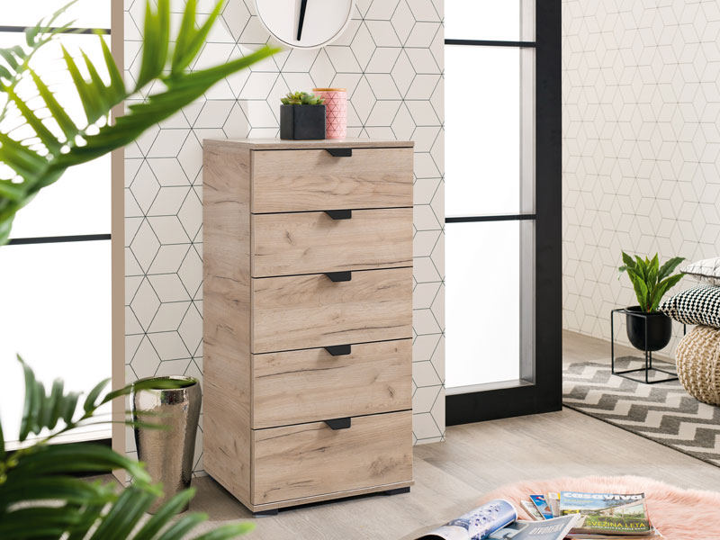 Komoda u dekoru sivog hrasta dizajnirana tako da po svojim dimenzijama širine, od 45 cm, ne zauzima mnogo prostora, a zahvaljujući upotrebnom prostoru koji obezbjeđuje pet fioka, spada u elemente sa velikom upotrebnom vrijednošću. Komoda je pogodna za opremanje predsoblja, dnevne zone ili spavaće sobe.