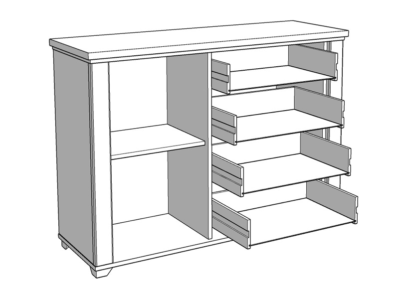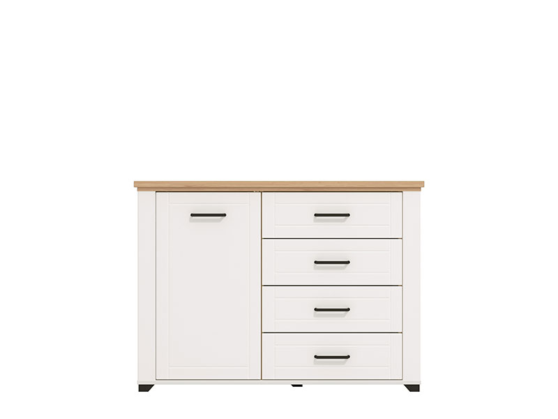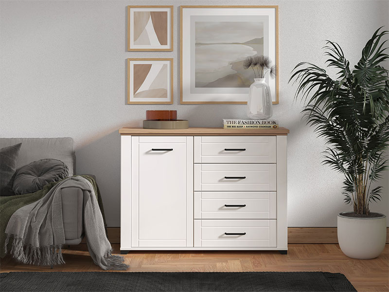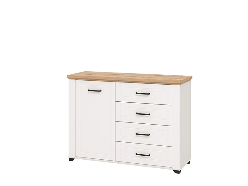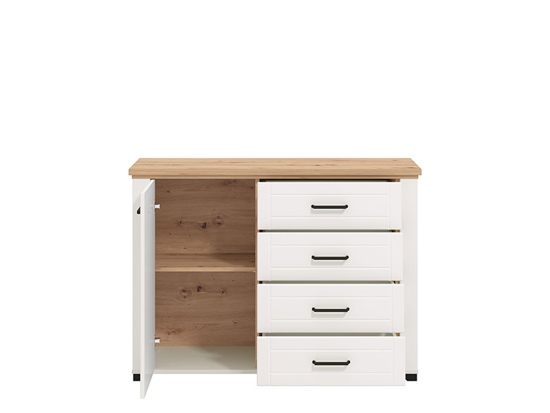 Komoda u kombinaciji dekora artisan hrasta, opak bijele i bijele mat folije, je estetski privlačno rješenje za uređenje ambijenta doma, koje daje topliju estetiku interijeru. Upotrebni prostor čine praktične fioke u desnom dijelu i zatvoreni dio, koji posjeduju praktično raspoređene police za odlaganje. Frontovi su obogaćeni crnim ručicama jednostavnog dizajna, a koje su usklađene sa dizajnerskom linijom cijele kolekcije.