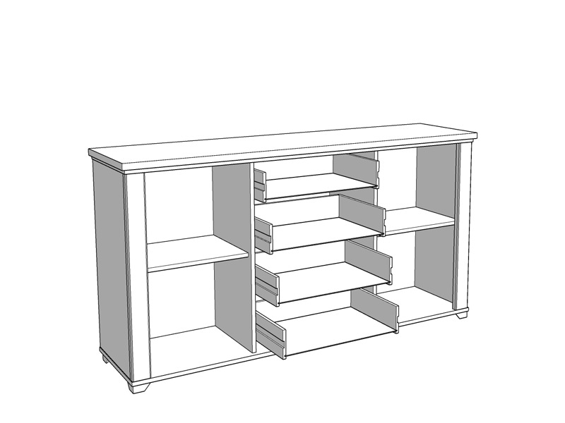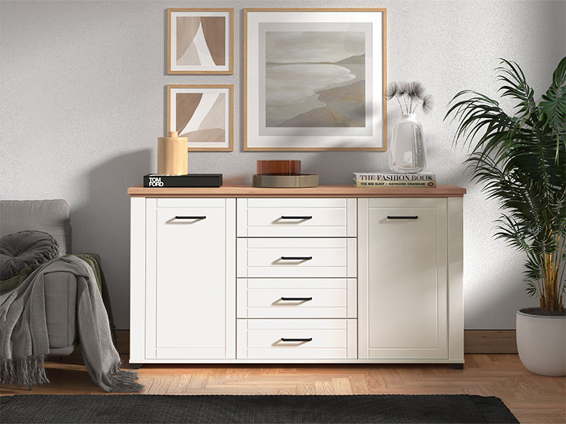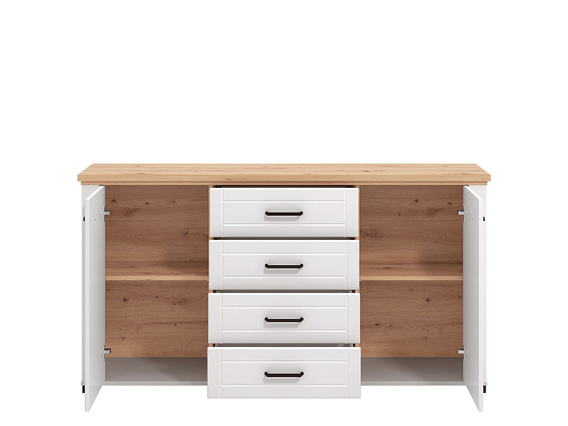 Komoda u kombinaciji dekora artisan hrasta, opak bijele i bijele mat folije, je dizajnerski privlačno rješenje za uređenje dnevnog boravka, koje daje topliju estetiku interijeru. Upotrebni prostor čine praktične fioke u središnjem dijelu i dva zatvorena dijela, koji posjeduju praktično raspoređene police za odlaganje. Frontovi su obogaćeni crnim ručicama jednostavnog dizajna, a koje su usklađene sa dizajnerskom linijom cijele kolekcije.