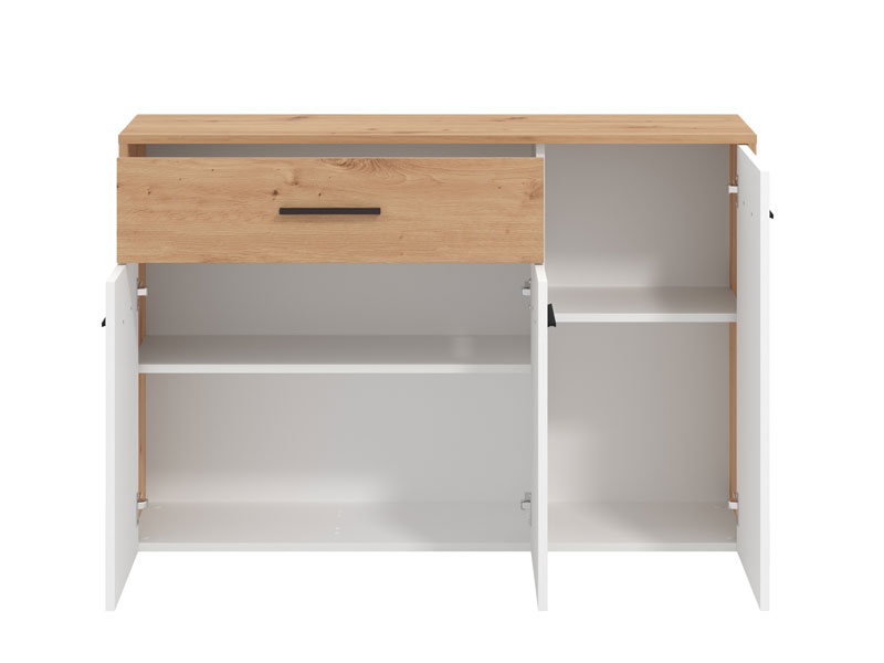 Komoda u dekoru artisan hrasta i opak bijele, dio je istoimene kolekcije elemenata spavaće/dječije sobe. Idealna je dopuna garderobnom dijelu zahvaljujući kombinaciji funkcionalne fioke i zatvorenih segmenata sa policom u središnjem dijelu.