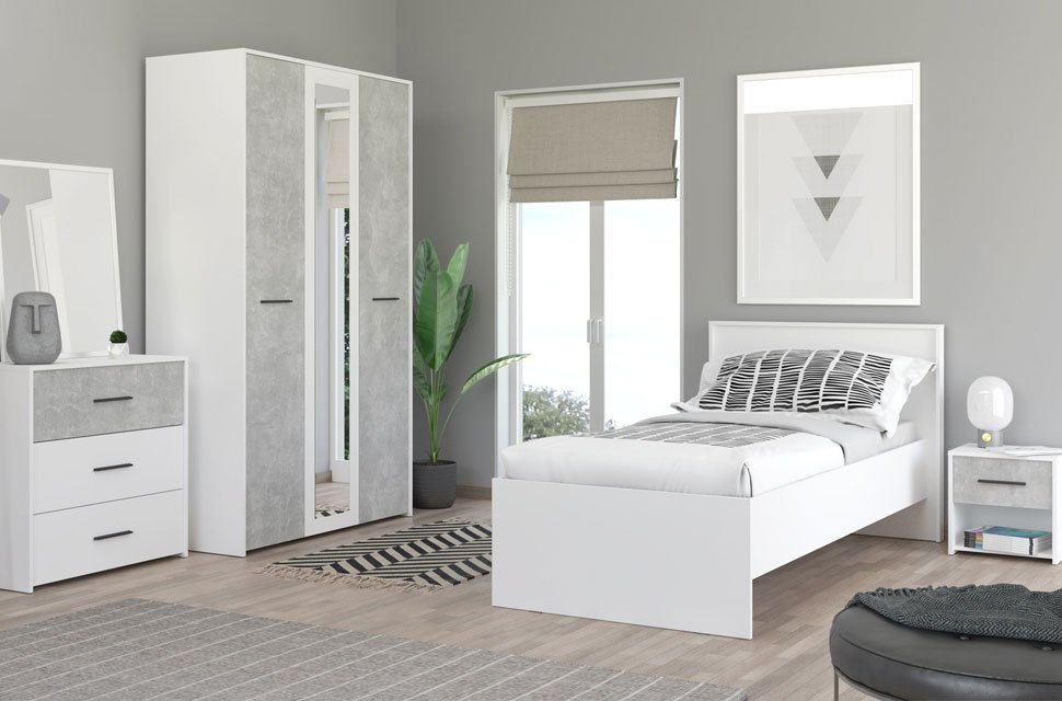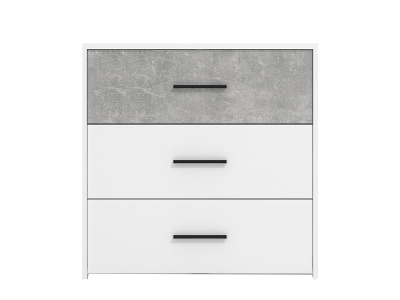 Komoda u dekoru opak bijele i betona, dio je istoimene kolekcije elemenata spavaće/dječije sobe. Ne zauzima mnogo prostora, a veoma je funckionalna jer posjeduje tri fioke i može biti idealna dopuna garderobnom dijelu.