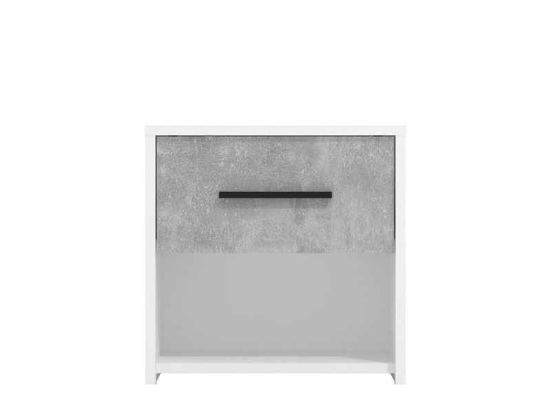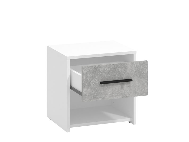 Noćni ormarić u dekoru opak bijele i betona, dio je istoimene kolekcije elemenata spavaće/dječije sobe. Idealna je dopuna spavaćem krevetu i doprinosi praktičnom uređenju ambijenta.