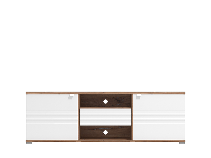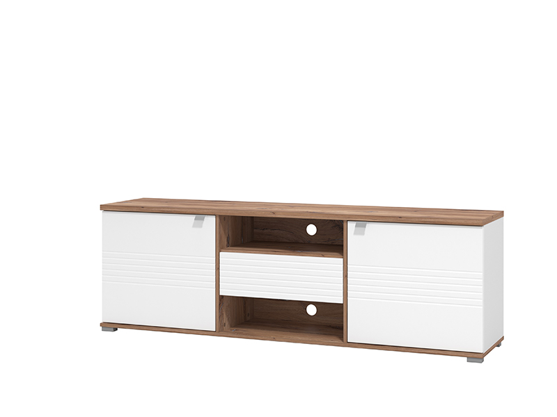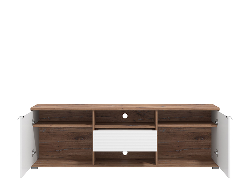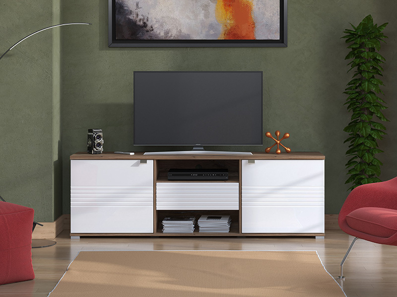TV komoda koja je sjajan funkcionalni dodatak za uređenje ambijenta dnevnog boravka. Kombinacija opak bijelog dekora, flagstaf hrasta i segmenata u dekoru bijele lak folije, unose osvježavajuću estetiku u ambijent. Dva bočna zatvorena segmenta, praktična fioka, kao i otvoreni dio sa dvije police, efektno doprinose funkcionalnoj organizaciji dnevnog boravka.
