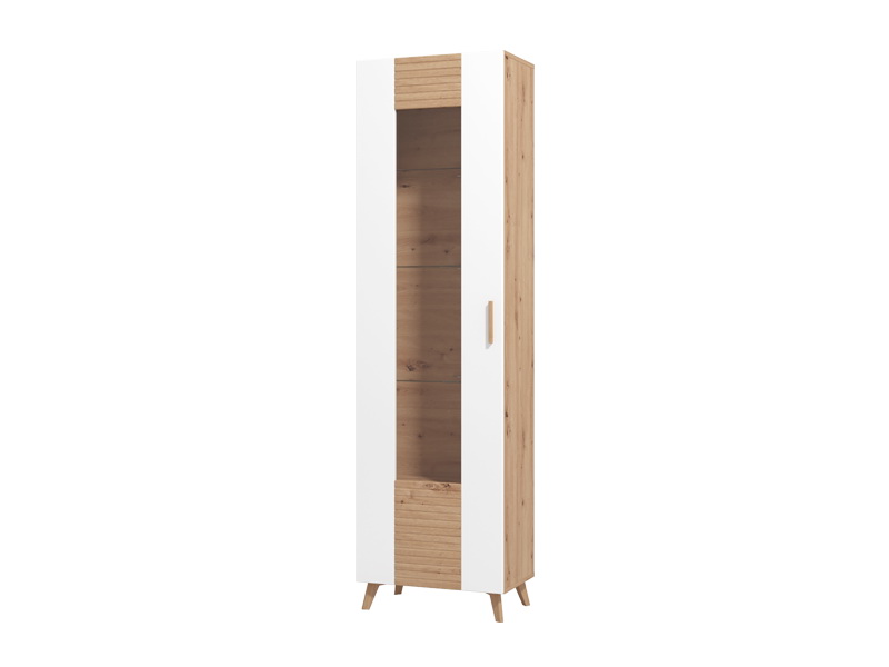 Vitrina je izrađena u kombinaciji dekora artisan hrasta sa segmentima u dekoru bijele lak folije, kao i artisan hrast folije, koji unose osvježavajuću estetiku u ambijent. Drvene ručice povezuju dekore u jednu estetsku cijelinu, dok visoki nogari ističu njihovu eleganciju. Funkcionalnosti ovog elementa doprinosi praktično raspoređen upotrebni prostor. Postoji mogućnost dodavanja rasvjete.