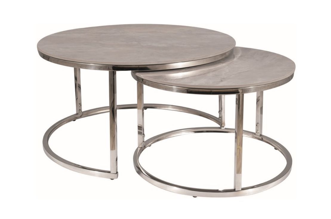 SET klub stolova Dimenzije Veći stol: 42x80 cm Manji stol: 38x60 cm Boja:sivi mramor, krom Materijal: keramika/nehrđajući čelik