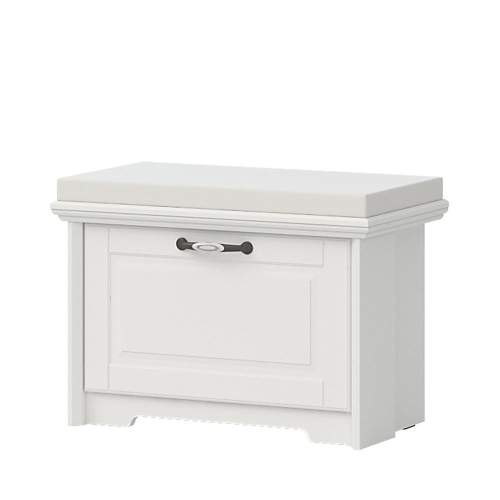 Komoda sa jednim krilom i tapaciranim jastukom za sedenje. Korpus elementa izrađen je od univera debljine 18mm u dekoru Polarni Bor, sa frontom i dekorativnom pokrivnom pločom od medijapana presvučenog mat folijom u boji slonove kosti. Stilski profilisane lajsne, koje su u sastavu ove komode, takođe su izrađene od medijapana debljine 25mm. Element sadrži jedan fah u drvo dekoru Polarni Bor. Ručica Evergreen (R-19), gasni mehanizam i podesive nožice uračunati su u cenu komode. Element je kantovan i sa zadnje strane. Tapacirani jastuk je od sundjera debljine 5cm, a tkanina od kvalitetnog materijala, gustog tkanja. Sastav tkanine je vodootporan i omogućuje lakše odstranjivanje fleka.
