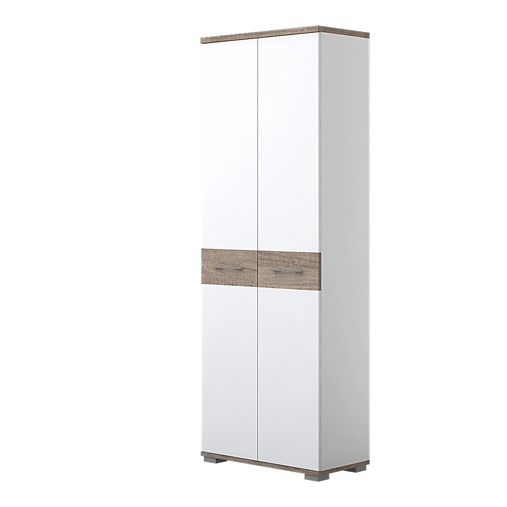 Vitrina sa dva krila. Plafon elementa je debljine 25mm, a pod 18mm, od univera u drvo dekoru Tamna Nebraska, dok je ostatak korpusa u beloj boji sa teksturom drveta debljine 18mm. Front elementa je od univera u belom drvo dekoru debljine 18mm sa aplkacijom u dekoru Tamna Nebraska. Sadrži jedan fah i garderobnu šipku sa funkcijom izvlačenja. Korpus elementa je kantovan i sa zadnje strane. Hromirane ručice, soft-close šarke i podesive nožice uračunate su u cenu elementa. Postoji mogućnost dodavanja više polica, koje su u ponudi dodatne opreme AZUR-F. Funkcionlna vitrina koja će ulaz u vaš dom učiniti urednim i lepo uređenim prostorom.