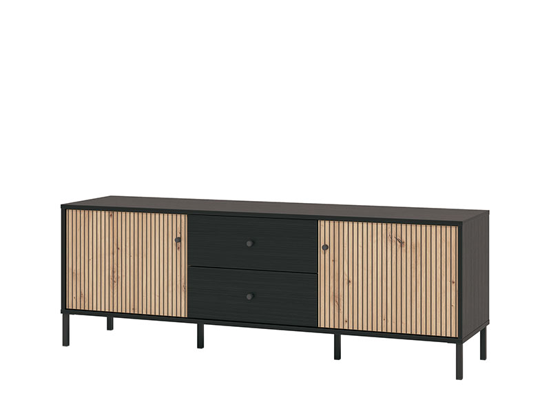 TV polica 3K2F2V je funkcionalni dodatak za opremanje dnevnog boravka. Kombinacija dekora artisan hrasta, crnog dekora sa teksturom, kao i artisan hrast dekora sa prugama, čini spoj koji prati dizajnerske trendove i učiniće svaki ambijent oličenjem modernog stila. Dva bočna zatvorena segmenta i otvorena polica efektno doprinose funkcionalnoj organizaciji dnevnog boravka. Deo je istoimenog sistema elemenata za uređenje ambijenta dnevnog boravka.