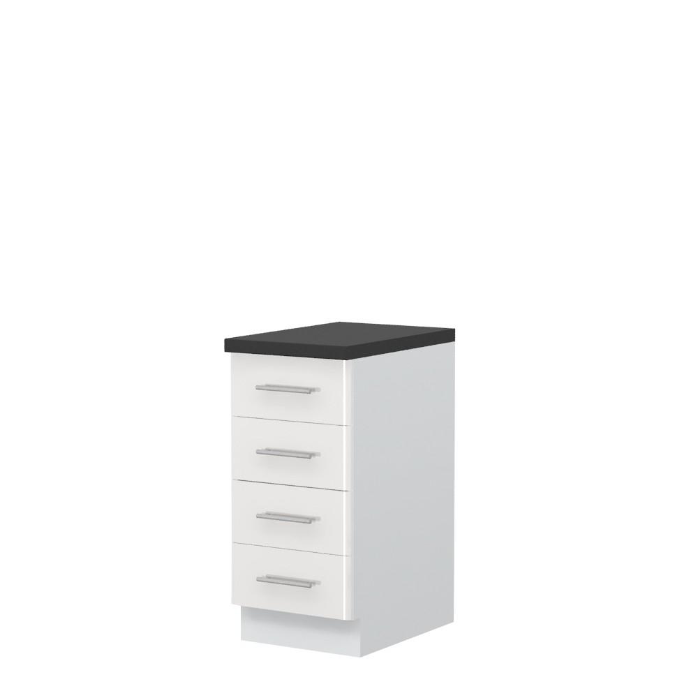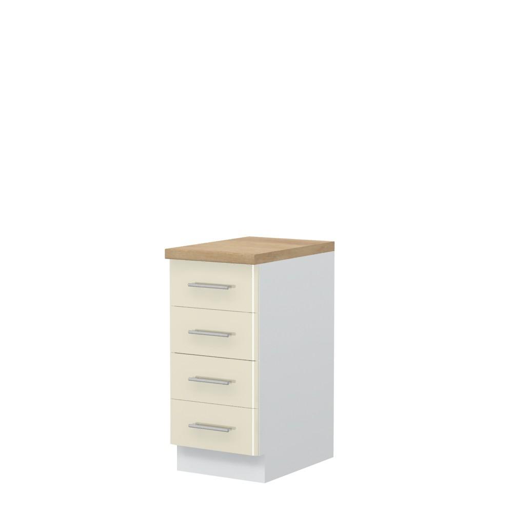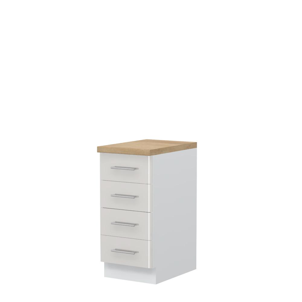 Radni kuhinjski element, širine 40cm, sa četiri fioke. Korpus elementa izrađen je od univera, debljine 18mm, u belom drvo dekoru. Front je od profilisanog medijapana u boji prema Vašem izboru iz ponuđene palete boja ovog modela. Korpus elementa je kantovan sa zadnje strane. Ima podesive nožice za nivelisanje na svim površinama. Radna ploča debljine 38mm, skriveni klizači sa usporivačima i sokla sa dihtung gumom uračunati su u cenu proizvoda. U ponudi je sedam dekora radnih ploča i šest dekora sokle. Mogućnost odabira više modela ručica u različitim dimenzijama, koje nisu uračunate u cenu elementa. Obezbedite dugotrajnost radne ploče ugradnjom dihtung lajsne. Dihtung lajsna, dužine 4m, dostupna je u dekoru radne ploče. Ukoliko želite, uz izbor dodatne opreme, bele bočne stranice možete zameniti bočnim panelima lakiranim UV lakom u boji prema Vašem izboru iz ponuđene palete boja ovog modela ili od univera u drvo dekoru Polarni bor, Nebraska hrast i Slonova kost. Istaknite završne bočne strane kuhinje ugradnjom dodatnih panela, debljine 16mm, lakiranih UV lakom u visokom sjaju u boji prema Vašem izboru iz ponuđene palete boja ovog modela ili ugradnjom dodatnih panela od univera debljine 25mm, dostupnim u drvo dekorima bele boje, Polarni bor i Nebraska hrast.