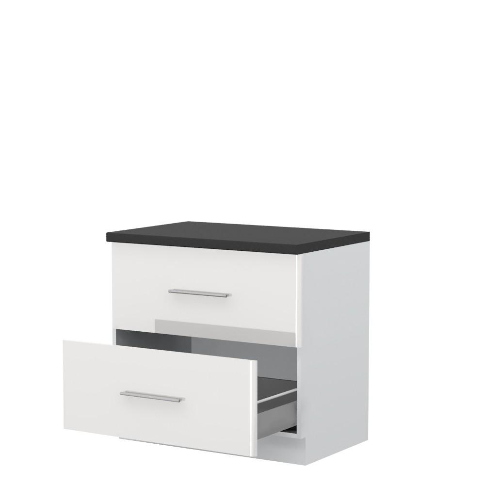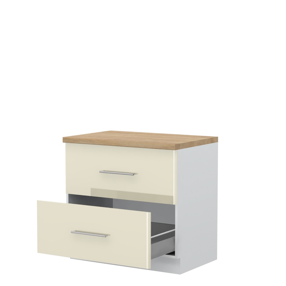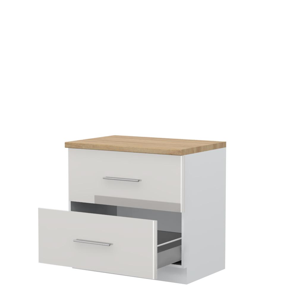Radni kuhinjski element, širine 90cm, sa dve metal-box fioke. Metal-box fioka, nosivosti do 30kg, ima potpuno izvlačenje. Korpus fioke izrađen je u kombinaciji metala i univera debljine 16mm. Korpus elementa izrađen je od univera, debljine 18mm, u belom drvo dekoru. Front je od profilisanog medijapana u boji prema Vašem izboru iz ponuđene palete boja ovog modela. Korpus elementa je kantovan sa zadnje strane. Ima podesive nožice za nivelisanje na svim površinama. Radna ploča debljine 38mm, skriveni klizači sa usporivačima i sokla sa dihtung gumom uračunati su u cenu proizvoda. U ponudi je sedam dekora radnih ploča i šest dekora sokle. Mogućnost odabira više modela ručica u različitim dimenzijama, koje nisu uračunate u cenu elementa. Obezbedite dugotrajnost radne ploče ugradnjom dihtung lajsne. Dihtung lajsna, dužine 4m, dostupna je u dekoru radne ploče. Ukoliko želite, uz izbor dodatne opreme, bele bočne stranice možete zameniti bočnim panelima lakiranim UV lakom u boji prema Vašem izboru iz ponuđene palete boja ovog modela ili od univera u drvo dekoru Polarni bor, Nebraska hrast i Slonova kost. Istaknite završne bočne strane kuhinje ugradnjom dodatnih panela, debljine 16mm, lakiranih UV lakom u visokom sjaju u boji prema Vašem izboru iz ponuđene palete boja ovog modela ili ugradnjom dodatnih panela od univera debljine 25mm, dostupnim u drvo dekorima bele boje, Polarni bor i Nebraska hrast.