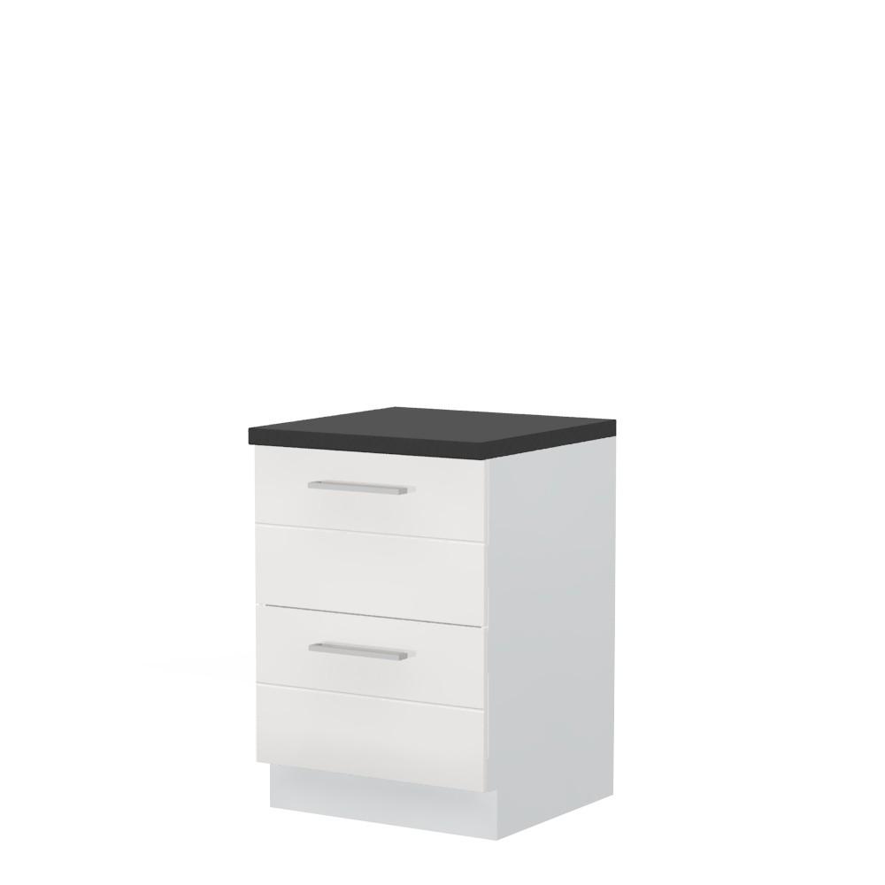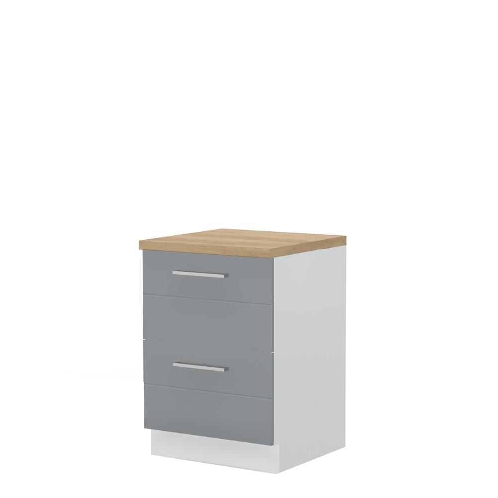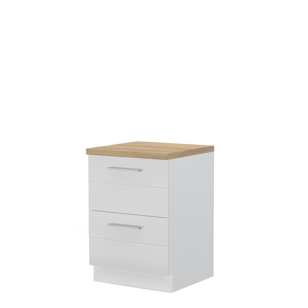 Radni kuhinjski element, širine 60cm, sa dve fioke. Korpus elementa izrađen je od univera, debljine 18mm, u belom drvo dekoru. Front je od profilisanog medijapana u boji prema Vašem izboru iz ponuđene palete boja ovog modela. Korpus elementa je kantovan sa zadnje strane. Ima podesive nožice za nivelisanje na svim površinama. Radna ploča debljine 38mm, skriveni klizači sa usporivačima i sokla sa dihtung gumom uračunati su u cenu proizvoda. U ponudi je sedam dekora radnih ploča i šest dekora sokle. Mogućnost odabira više modela ručica u različitim dimenzijama, koje nisu uračunate u cenu elementa. Obezbedite dugotrajnost radne ploče ugradnjom dihtung lajsne. Dihtung lajsna, dužine 4m, dostupna je u dekoru radne ploče. Ukoliko želite, uz izbor dodatne opreme, bele bočne stranice možete zameniti bočnim panelima lakiranim UV lakom u boji prema Vašem izboru iz ponuđene palete boja ovog modela ili od univera u drvo dekoru Polarni bor, Nebraska hrast i Slonova kost. Istaknite završne bočne strane kuhinje ugradnjom dodatnih panela, debljine 16mm, lakiranih UV lakom u visokom sjaju u boji prema Vašem izboru iz ponuđene palete boja ovog modela ili ugradnjom dodatnih panela od univera debljine 25mm, dostupnim u drvo dekorima bele boje, Polarni bor i Nebraska hrast.