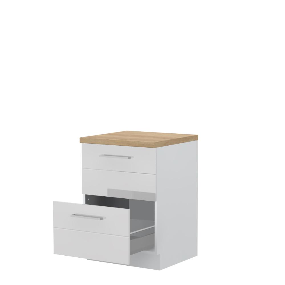 Radni kuhinjski element, širine 60cm, sa dve metal-box fioke. Metal-box fioka, nosivosti do 30kg, ima potpuno izvlačenje. Korpus fioke izrađen je u kombinaciji metala i univera debljine 16mm. Korpus elementa izrađen je od univera, debljine 18mm, u belom drvo dekoru. Front je od profilisanog medijapana u boji prema Vašem izboru iz ponuđene palete boja ovog modela. Korpus elementa je kantovan sa zadnje strane. Ima podesive nožice za nivelisanje na svim površinama. Radna ploča debljine 38mm, skriveni klizači sa usporivačima i sokla sa dihtung gumom uračunati su u cenu proizvoda. U ponudi je sedam dekora radnih ploča i šest dekora sokle. Mogućnost odabira više modela ručica u različitim dimenzijama, koje nisu uračunate u cenu elementa. Obezbedite dugotrajnost radne ploče ugradnjom dihtung lajsne. Dihtung lajsna, dužine 4m, dostupna je u dekoru radne ploče. Ukoliko želite, uz izbor dodatne opreme, bele bočne stranice možete zameniti bočnim panelima lakiranim UV lakom u boji prema Vašem izboru iz ponuđene palete boja ovog modela ili od univera u drvo dekoru Polarni bor, Nebraska hrast i Slonova kost. Istaknite završne bočne strane kuhinje ugradnjom dodatnih panela, debljine 16mm, lakiranih UV lakom u visokom sjaju u boji prema Vašem izboru iz ponuđene palete boja ovog modela ili ugradnjom dodatnih panela od univera debljine 25mm, dostupnim u drvo dekorima bele boje, Polarni bor i Nebraska hrast.