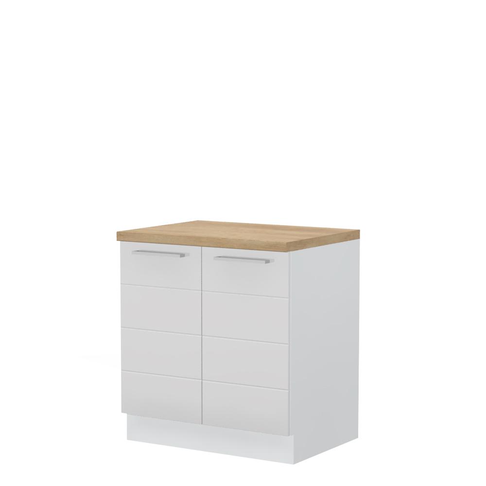 Radni kuhinjski element, širine 80cm, sa dva krila. Korpus elementa izrađen je od univera, debljine 18mm, u belom drvo dekoru. Front je od profilisanog medijapana u boji prema Vašem izboru iz ponuđene palete boja ovog modela. Korpus elementa je kantovan sa zadnje strane. Ima podesive nožice za nivelisanje na svim površinama. Radna ploča debljine 38mm, soft-close šarke, sokla sa dihtung gumom i jedan fah uračunati su u cenu proizvoda. U ponudi je sedam dekora radnih ploča i šest dekora sokle. Mogućnost odabira više modela ručica u različitim dimenzijama, koje nisu uračunate u cenu elementa. Obezbedite dugotrajnost radne ploče ugradnjom dihtung lajsne. Dihtung lajsna, dužine 4m, dostupna je u dekoru radne ploče. Ukoliko želite, uz izbor dodatne opreme, bele bočne stranice možete zameniti bočnim panelima lakiranim UV lakom u boji prema Vašem izboru iz ponuđene palete boja ovog modela ili od univera u drvo dekoru Polarni bor, Nebraska hrast i Slonova kost. Istaknite završne bočne strane kuhinje ugradnjom dodatnih panela, debljine 16mm, lakiranih UV lakom u visokom sjaju u boji prema Vašem izboru iz ponuđene palete boja ovog modela ili ugradnjom dodatnih panela od univera debljine 25mm, dostupnim u drvo dekorima bele boje, Polarni bor i Nebraska hrast.