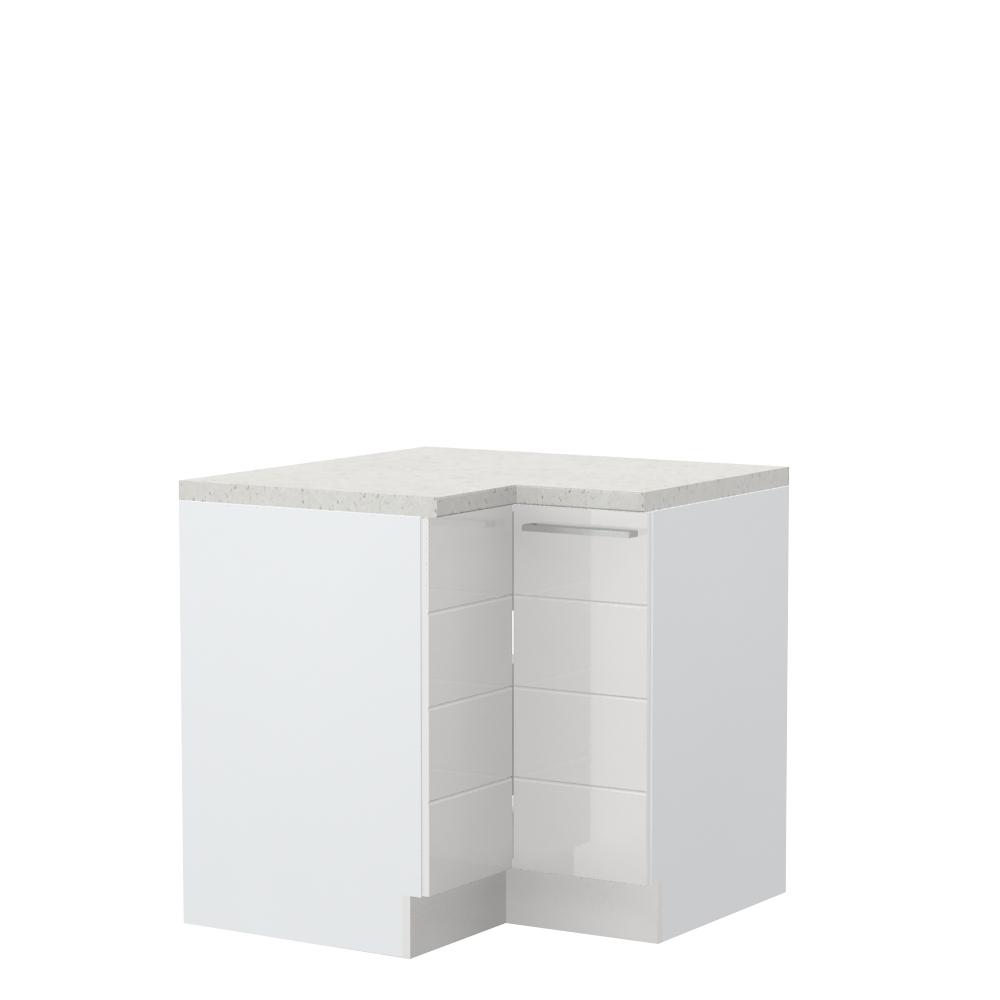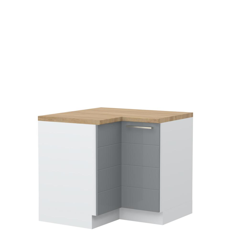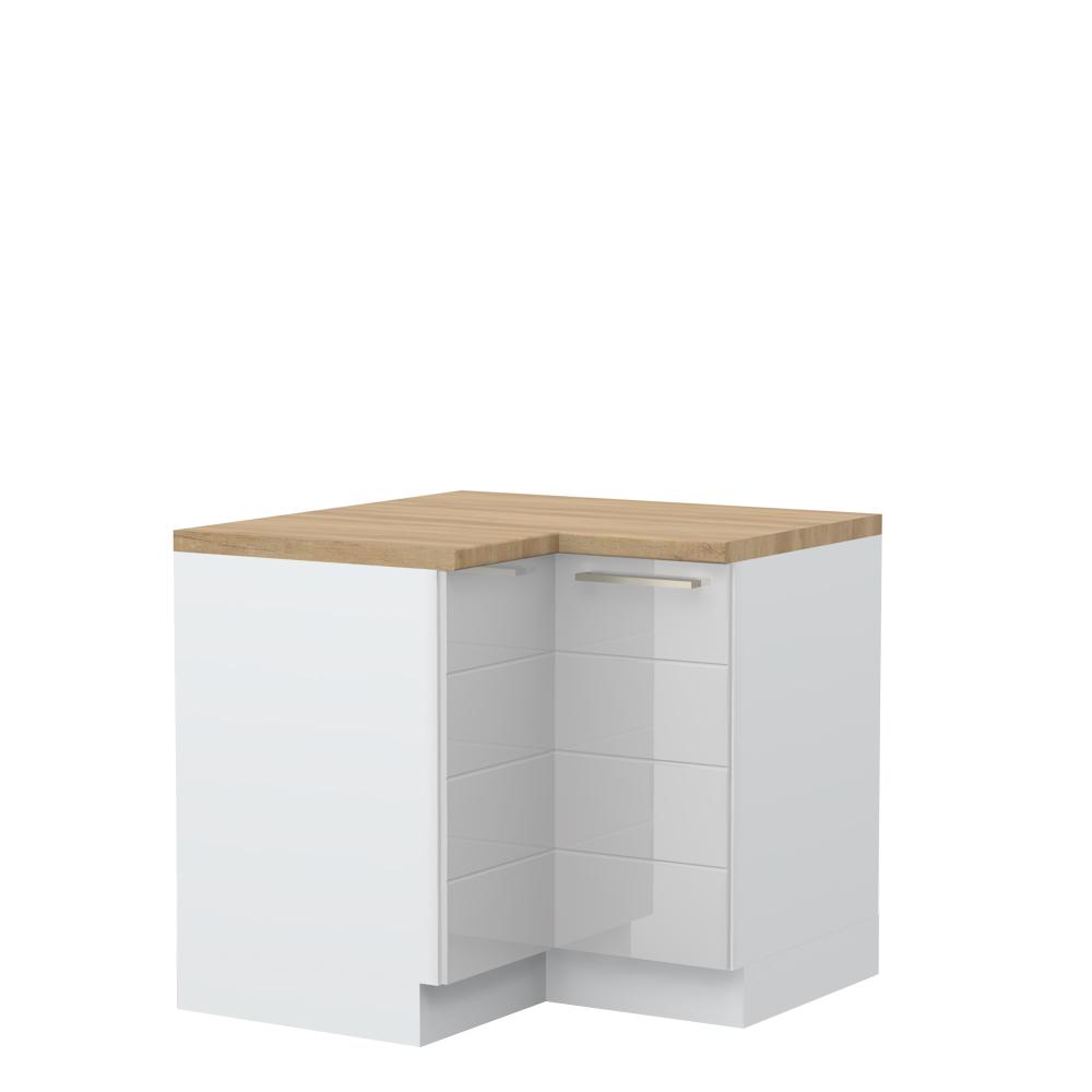 Radni ugaoni kuhinjski element, sa dva krila. Korpus elementa izrađen je od univera, debljine 18mm, u belom drvo dekoru. Front je od profilisanog medijapana u boji prema Vašem izboru iz ponuđene palete boja ovog modela. Korpus elementa je kantovan sa zadnje strane. Ima podesive nožice za nivelisanje na svim površinama. Radna ploča debljine 38mm, sokla sa dihtung gumom i jedan fah uračunati su u cenu proizvoda. U ponudi je sedam dekora radnih ploča i šest dekora sokle. Umesto jednog faha, može se dokupiti žičani ugaoni element, Z-UG. Mogućnost odabira više modela ručica u različitim dimenzijama, koje nisu uračunate u cenu elementa. Obezbedite dugotrajnost radne ploče ugradnjom dihtung lajsne. Dihtung lajsna, dužine 4m, dostupna je u dekoru radne ploče. Ukoliko želite, uz izbor dodatne opreme, bele bočne stranice možete zameniti bočnim panelima lakiranim UV lakom u boji prema Vašem izboru iz ponuđene palete boja ovog modela ili od univera u drvo dekoru Polarni bor, Nebraska hrast i Slonova kost. Istaknite završne bočne strane kuhinje ugradnjom dodatnih panela, debljine 16mm, lakiranih UV lakom u visokom sjaju u boji prema Vašem izboru iz ponuđene palete boja ovog modela ili ugradnjom dodatnih panela od univera debljine 25mm, dostupnim u drvo dekorima bele boje, Polarni bor i Nebraska hrast.