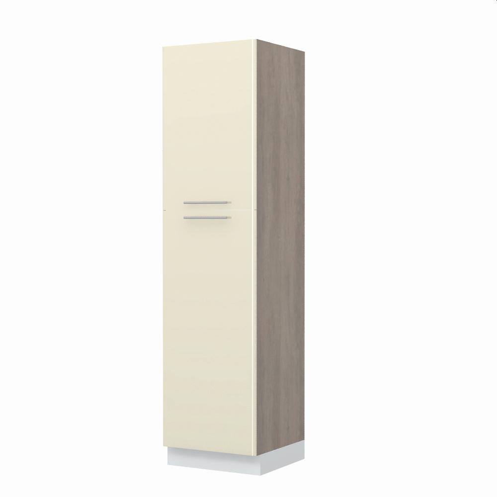Kombinovani kuhinjski element, visine 235cm, sa bočnim stranama od profilisanog medijapana, predviđen za ugradnju frižidera. Kompatibilan je sa kuhinjama sa visećim elementima visine 91cm (V9). Korpus elementa je od univera debljine 18mm, dok su bočne stranice od medijapana i mogu biti u visokom sjaju bež i bele boje ili u mat boji slonove kosti. Front je od profilisanog medijapana u boji prema Vašem izboru iz ponuđene palete boja ovog modela. Ima dve police i jedan štelujući panel sa metalnim “L†nosačima, za pozicioniranje ugradnog frižidera. Korpus elementa je kantovan sa zadnje strane. Ima podesive nožice za nivelisanje na svim površinama. Soft-close šarke i sokla sa dihtung gumom uračunati su u cenu proizvoda. U ponudi su šest dekora sokle. Mogućnost odabira više modela ručica u različitim dimenzijama, koje nisu uračunate u cenu elementa. Istaknite završne bočne strane kuhinje ugradnjom dodatnih panela lakiranih UV lakom u visokom sjaju debljine 16 mm,i to:u kristalno beloj i bež boji ili drvo dekorima Nebraske i Tamne Nebraske ili ugradnjom dodatnih panela od univera debljine 25 mm,dostupnim u drvo dekorima bele boje,Polarnog bora i Nebraska Hrast. Postignite efektan izgled kuhinje postavljanjem završnih lajsni debljine 25mm, od univera u ponuđenim drvo dekorima ili od medijapana u boji fronta Vaše kuhinje. Štelujući panel, kao dodatna oprema, može imati funkciju dodatne police. Radni vek frižidera može se produžiti boljom cirkulacijom vazduha unutar elementa, uz pomoć aluminijumske rešetke, koja se ugrađuje u soklu.