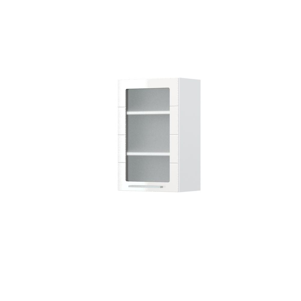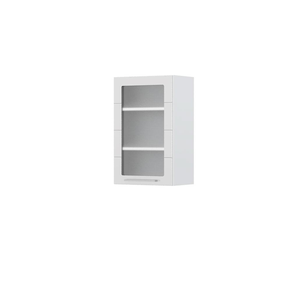 Viseći kuhinjski element, širine 45cm, sa jednim krilom sa kaljenim staklom debljine 4mm. Korpus elementa izrađen je od univera debljine 18mm, u belom drvo dekoru. Front je od profilisanog medijapana u boji prema Vašem izboru iz ponuđene palete boja ovog modela. Dubina elementa je 32cm. Korpus elementa je kantovan sa zadnje strane. Soft-close šarke, dva faha i šina za postavljanje i lakše nivelisanje elementa, uračunate su u cenu proizvoda. Mogućnost odabira više modela ručica u različitim dimenzijama, koje nisu uračunate u cenu elementa. Ukoliko želite, uz izbor dodatne opreme, bele bočne stranice možete zameniti bočnim panelima lakiranim UV lakom u boji prema Vašem izboru iz ponuđene palete boja ovog modela ili od univera u drvo dekoru Polarni bor, Nebraska hrast i Slonova kost. Istaknite završne bočne strane kuhinje ugradnjom dodatnih panela, debljine 16mm, lakiranih UV lakom u visokom sjaju u boji prema Vašem izboru iz ponuđene palete boja ovog modela ili ugradnjom dodatnih panela od univera debljine 25mm, dostupnim u drvo dekorima bele boje, Polarni bor i Nebraska hrast. Postignite efektan izgled kuhinje postavljanjem završnih lajsni debljine 25mm, od univera u ponuđenim drvo dekorima ili od medijapana u boji fronta Vaše kuhinje.