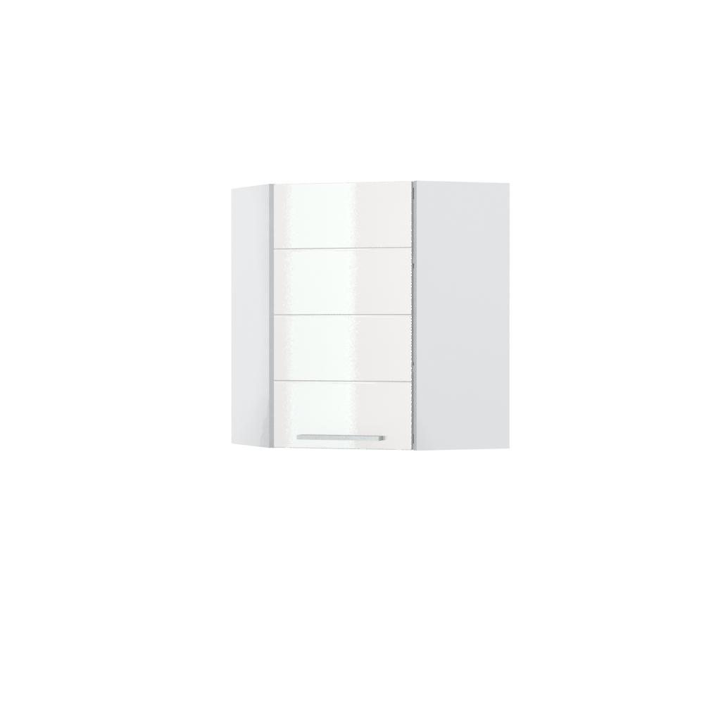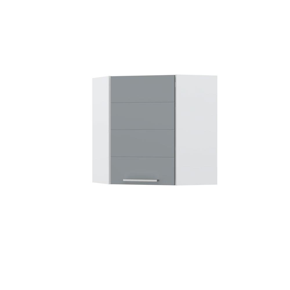 Ugaoni viseći element sa jednim krilom. Korpus elementa izrađen je od univera debljine 18mm, u belom drvo dekoru. Front je od profilisanog medijapana u boji prema Vašem izboru iz ponuđene palete boja ovog modela. Korpus elementa je kantovan sa zadnje strane. Dva faha i šina za postavljanje i lakše nivelisanje elementa, uračunate su u cenu proizvoda. Mogućnost odabira više modela ručica u različitim dimenzijama, koje nisu uračunate u cenu elementa. Ukoliko želite, uz izbor dodatne opreme, bele bočne stranice možete zameniti bočnim panelima lakiranim UV lakom u boji prema Vašem izboru iz ponuđene palete boja ovog modela ili od univera u drvo dekoru Polarni bor, Nebraska hrast i Slonova kost. Istaknite završne bočne strane kuhinje ugradnjom dodatnih panela, debljine 16mm, lakiranih UV lakom u visokom sjaju u boji prema Vašem izboru iz ponuđene palete boja ovog modela ili ugradnjom dodatnih panela od univera debljine 25mm, dostupnim u drvo dekorima bele boje, Polarni bor i Nebraska hrast. Postignite efektan izgled kuhinje postavljanjem završnih lajsni debljine 25mm, od univera u ponuđenim drvo dekorima ili od medijapana u boji fronta Vaše kuhinje.
