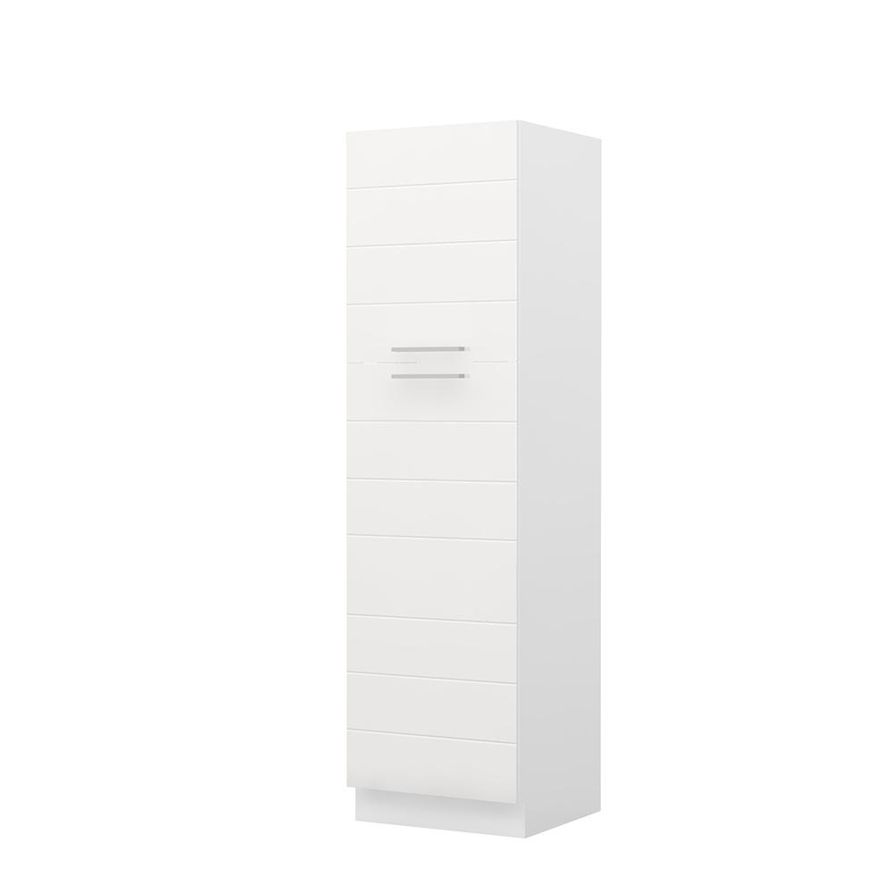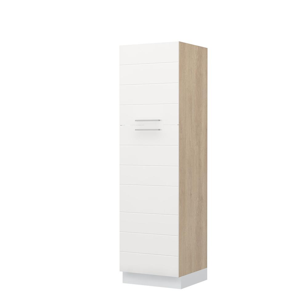Kombinovani kuhinjski element, visine 216cm, sa bočnim stranama od profilisanog medijapana u boji fronta, predviđen za ugradnju frižidera. Kompatibilan je sa kuhinjama sa visećim elementima visine 72cm (V7). Korpus elementa je od univera debljine 18mm u belom drvo dekoru, dok su bočne stranice od medijapana i mogu biti u visokom sjaju bež i bele boje ili u mat boji slonove kosti. Front je od profilisanog medijapana u boji prema Vašem izboru iz ponuđene palete boja ovog modela. Ima jednu policu i jedan štelujući panel sa metalnim “L†nosačima, za pozicioniranje ugradnog frižidera. Korpus elementa je kantovan sa zadnje strane. Ima podesive nožice za nivelisanje na svim površinama. Soft-close šarke i sokla sa dihtung gumom uračunati su u cenu proizvoda. U ponudi su šest dekora sokle. Mogućnost odabira više modela ručica u različitim dimenzijama, koje nisu uračunate u cenu elementa. Istaknite završne bočne strane kuhinje ugradnjom dodatnih panela lakiranih UV lakom u visokom sjaju debljine 16 mm,i to:u kristalno beloj i bež boji ili drvo dekorima Nebraske i Tamne Nebraske ili ugradnjom dodatnih panela od univera debljine 25 mm,dostupnim u drvo dekorima bele boje,Polarnog bora i Nebraska Hrast. Postignite efektan izgled kuhinje postavljanjem završnih lajsni debljine 25mm, od univera u ponuđenim drvo dekorima ili od medijapana u boji fronta Vaše kuhinje. Štelujući panel, kao dodatna oprema, može imati funkciju dodatne police. Radni vek frižidera može se produžiti boljom cirkulacijom vazduha unutar elementa, uz pomoć aluminijumske rešetke, koja se ugrađuje u soklu.