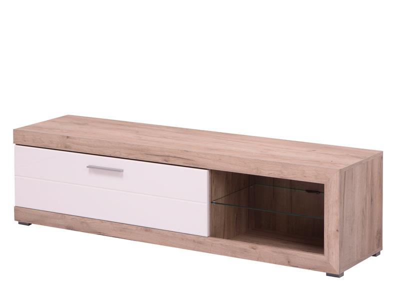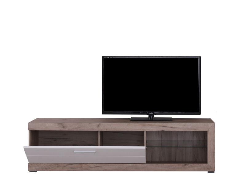 TV polica - u sivom hrast dezenu sa bijelom lak folijom, sa kombinacijom otvorenog i zatvorenog segmenta sa pregradnim dijelom, prati praktične enterijerske inovacije koje će se idealno integrirati u ambijent vašeg dnevnog boravka.