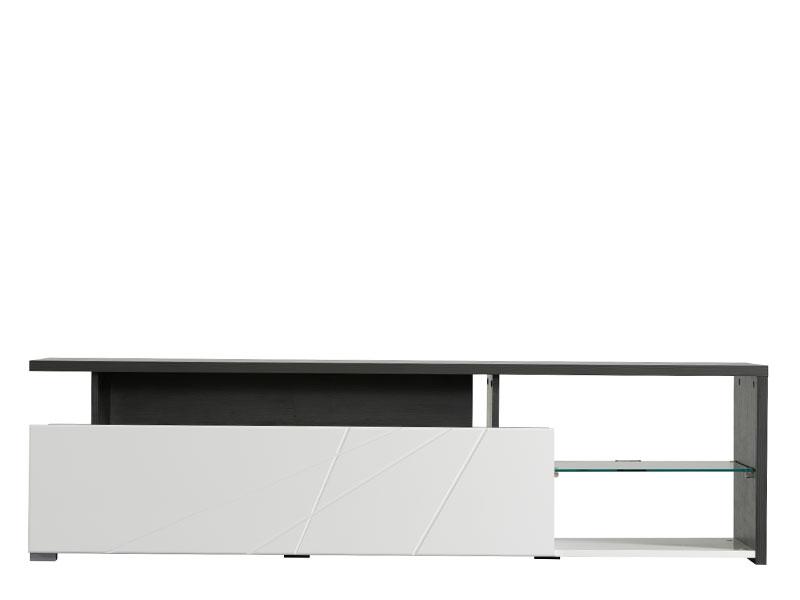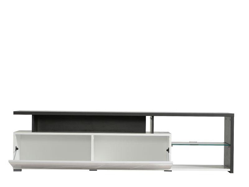 TV polica, u dekoru crnog drveta i bijeloj 3D MDF lak foliji sa aplikacijom na frontu, posjeduje kombinaciju otvorenog i zatvorenog segmenta. TV polica sa izdignutim dijelom prati interijerske inovacije, zahvaljujući čemu će se idealno integrirati u ambijent vašeg dnevnog boravka.