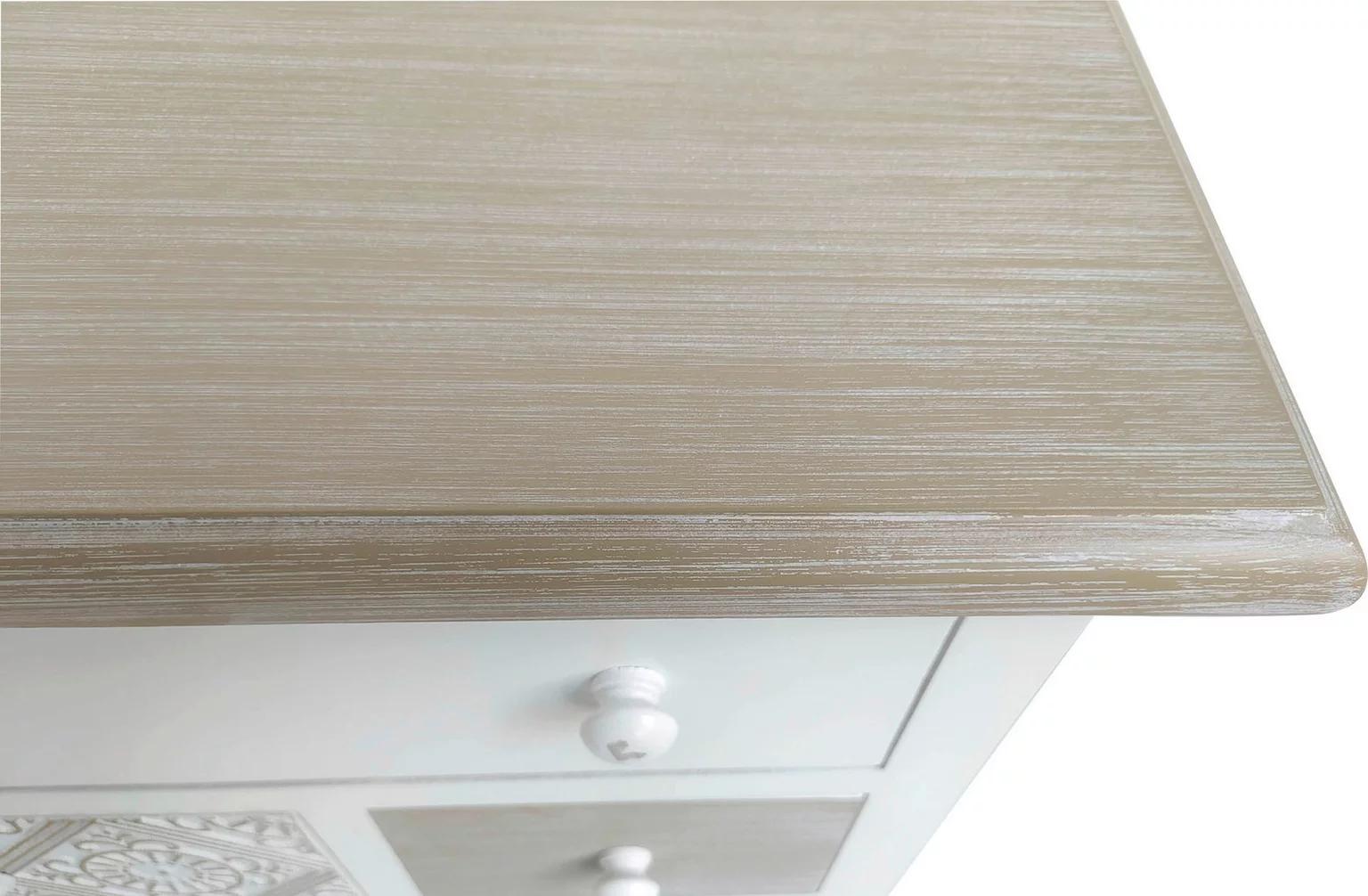 U kombinaciji bijele i prirodne boje, ova komoda blista u vintage stilu, s blago etno elementima koji daju poseban šarm.