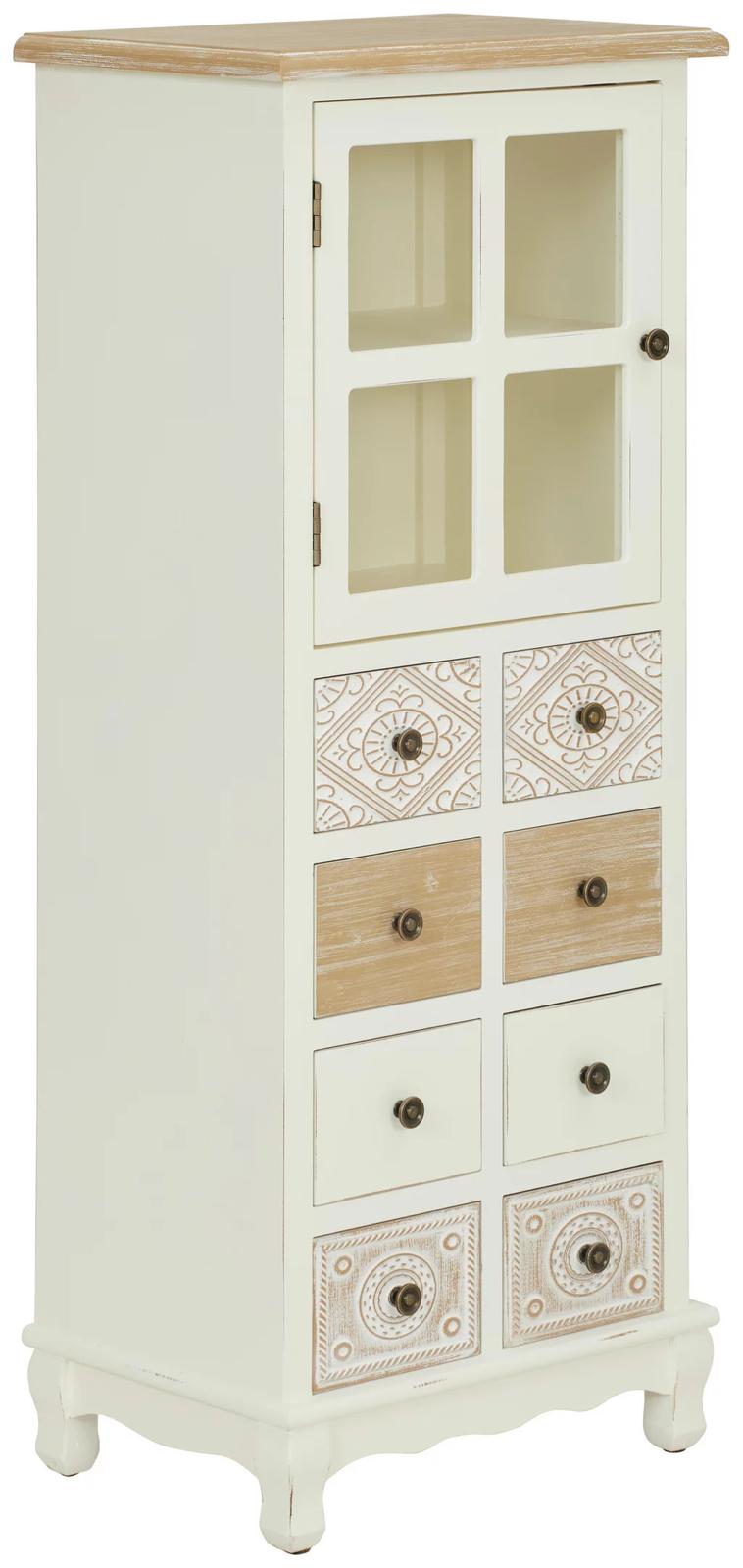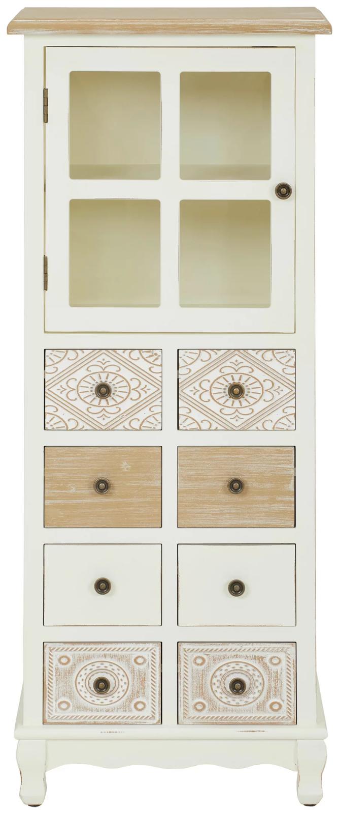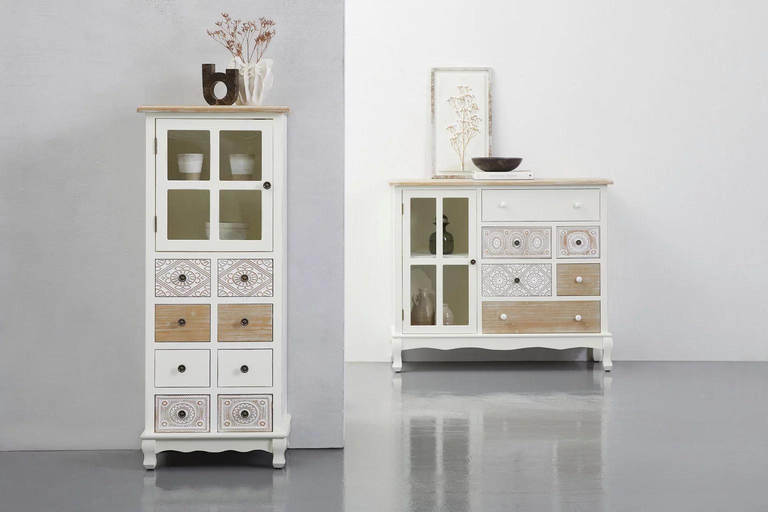 U kombinaciji bijele i prirodne boje, ova komoda blista u vintage stilu, s blago etno elementima koji daju poseban šarm.